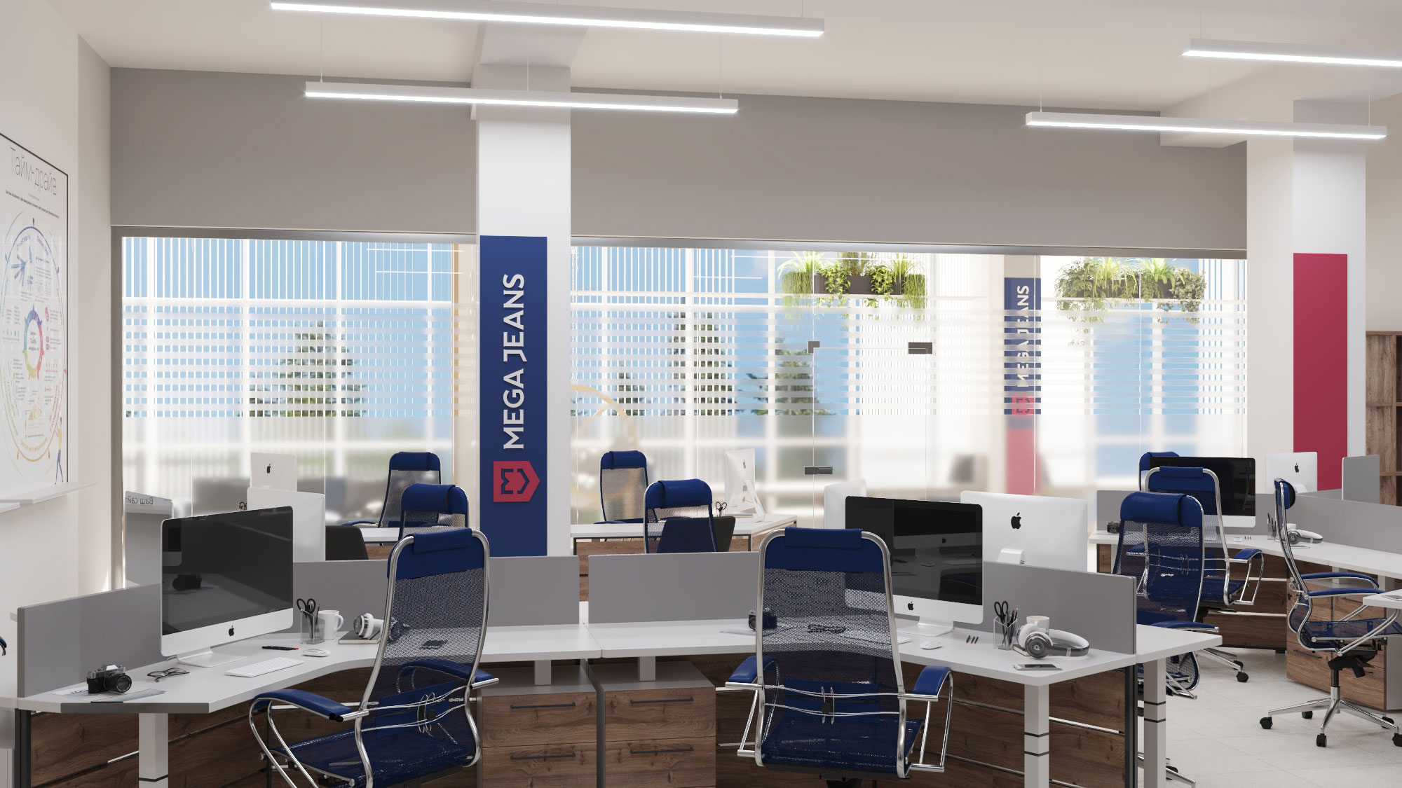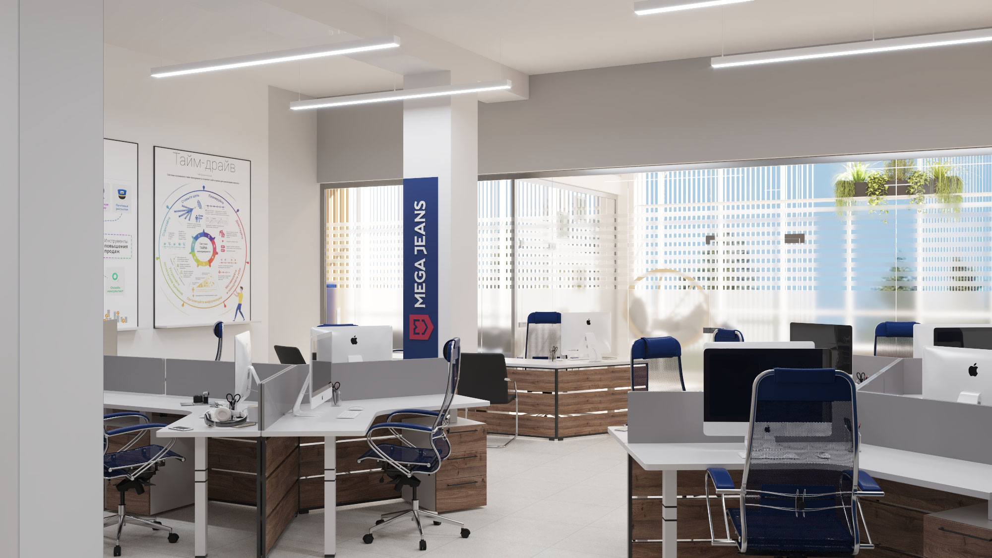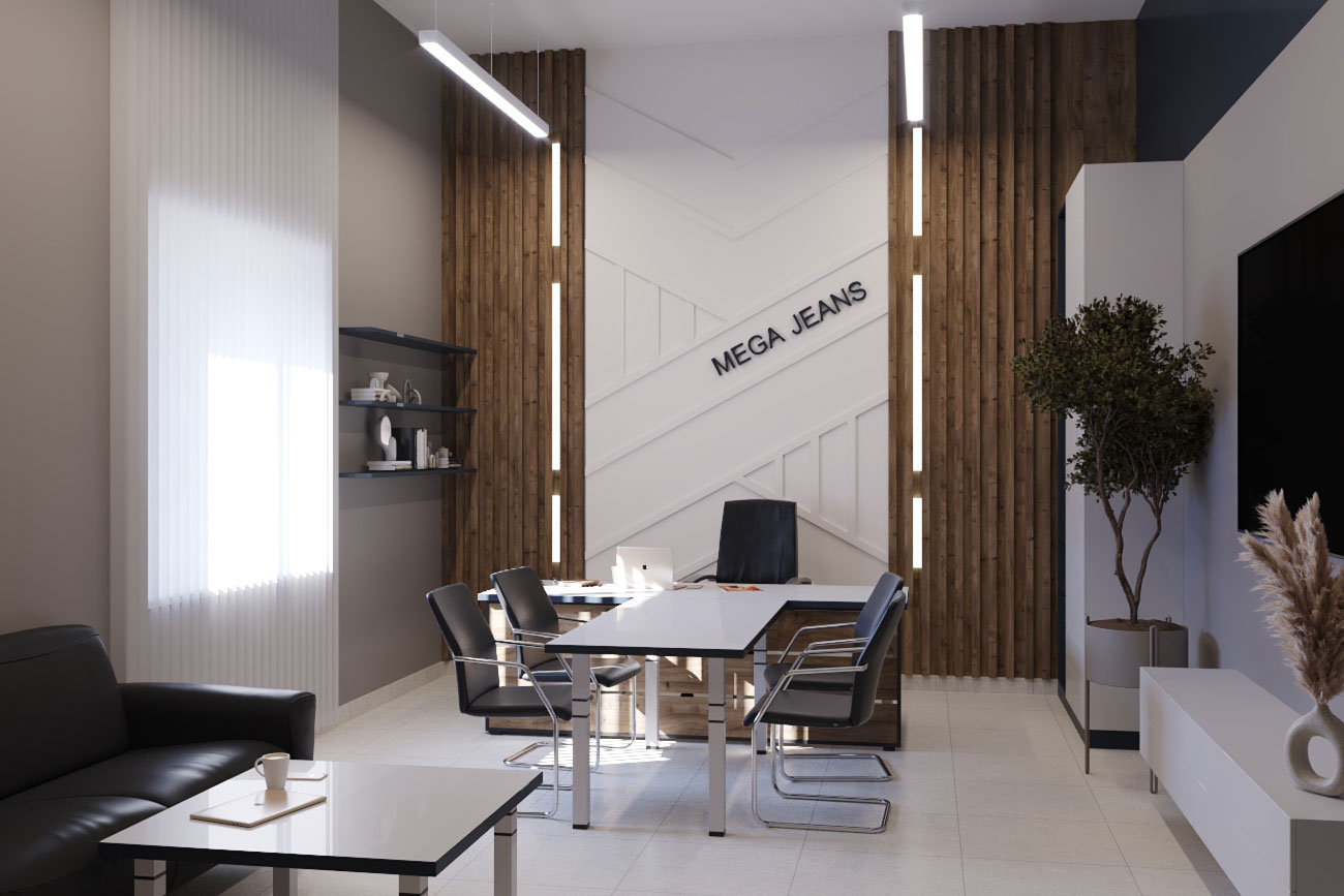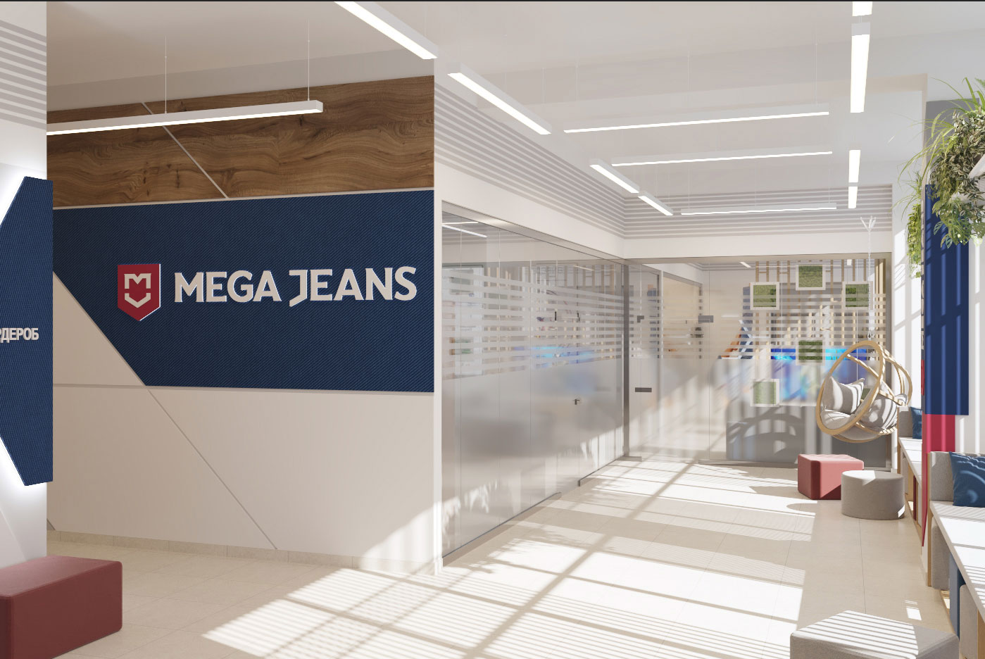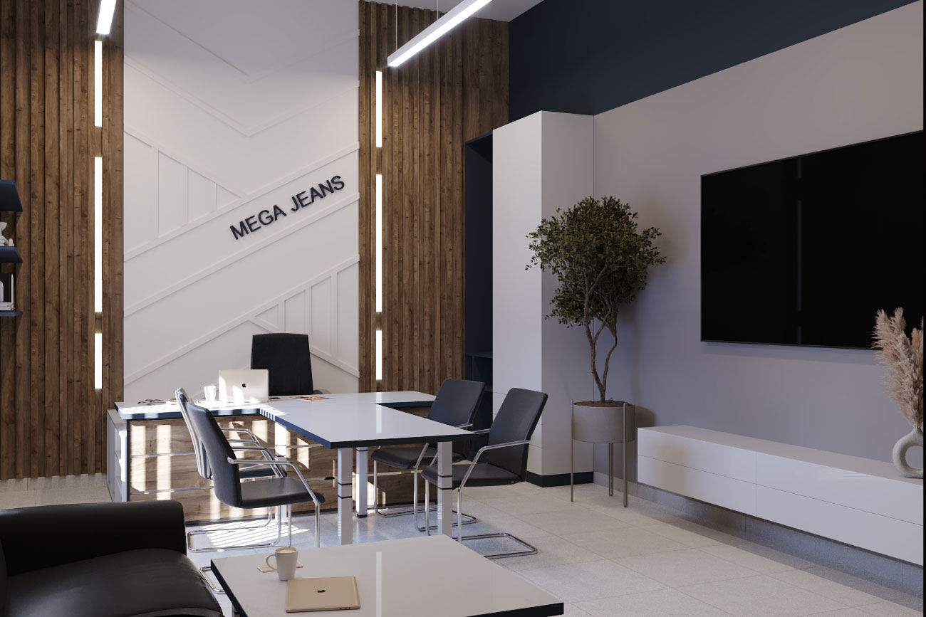Дизайн проект интерьера офиса компании Mega Jeans в Кирове, общая площадь - 475 кв.м. Разработка дизайн проекта выполнялась в соответствии с Brand Book компании, с учетом фирменного стиля и утвержденных оттенков.