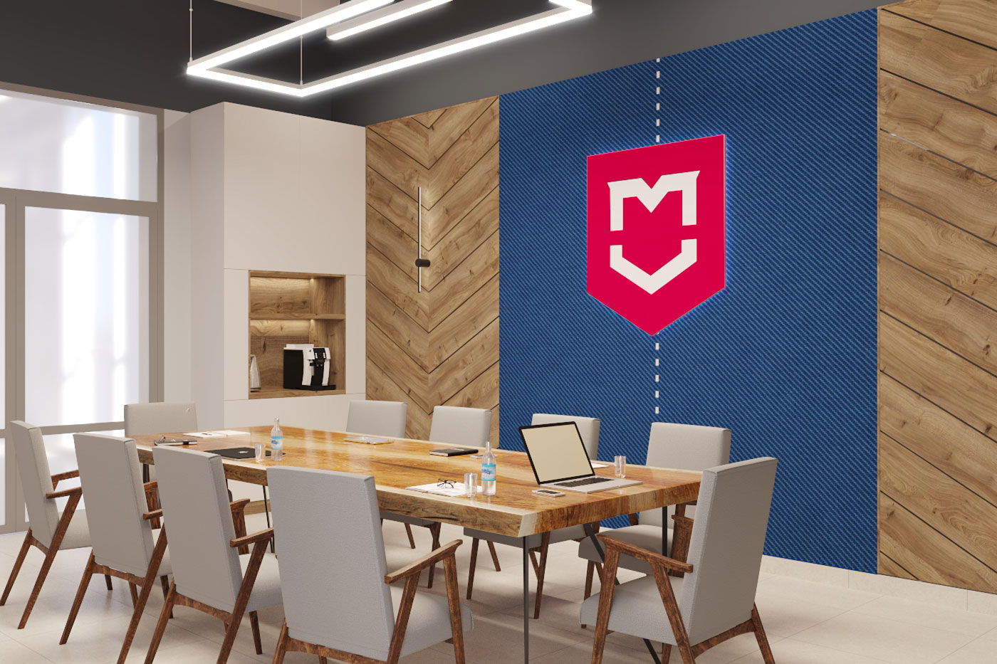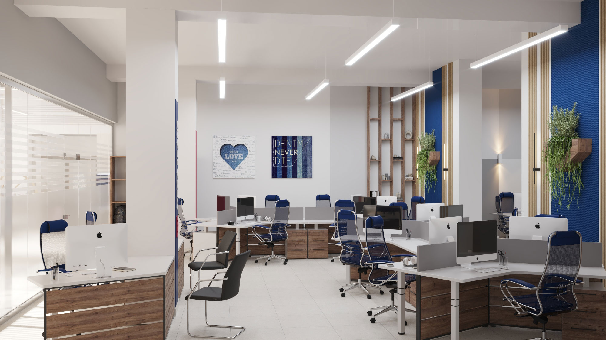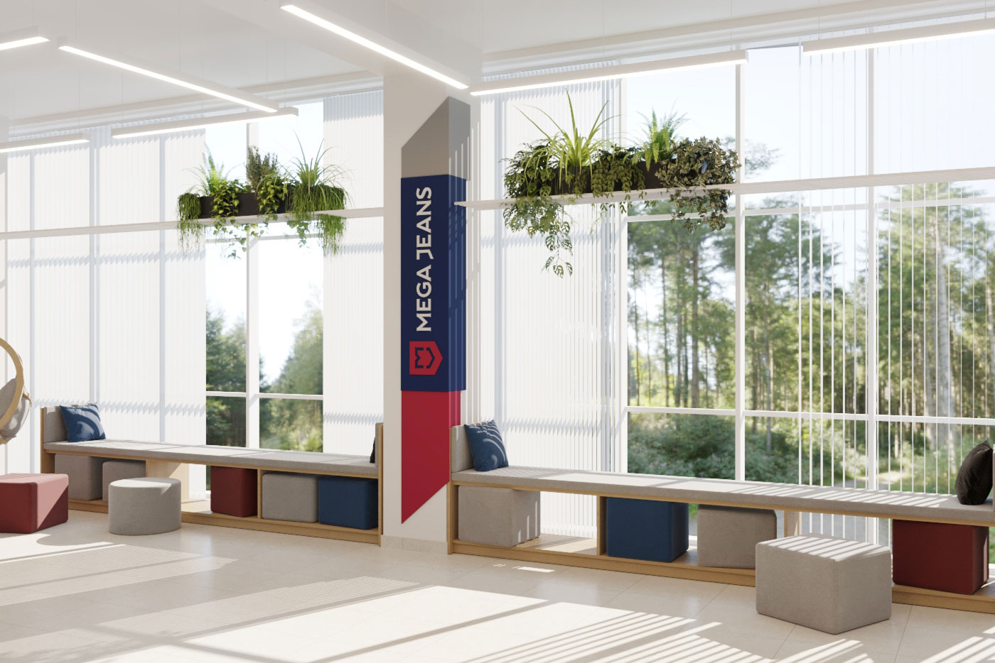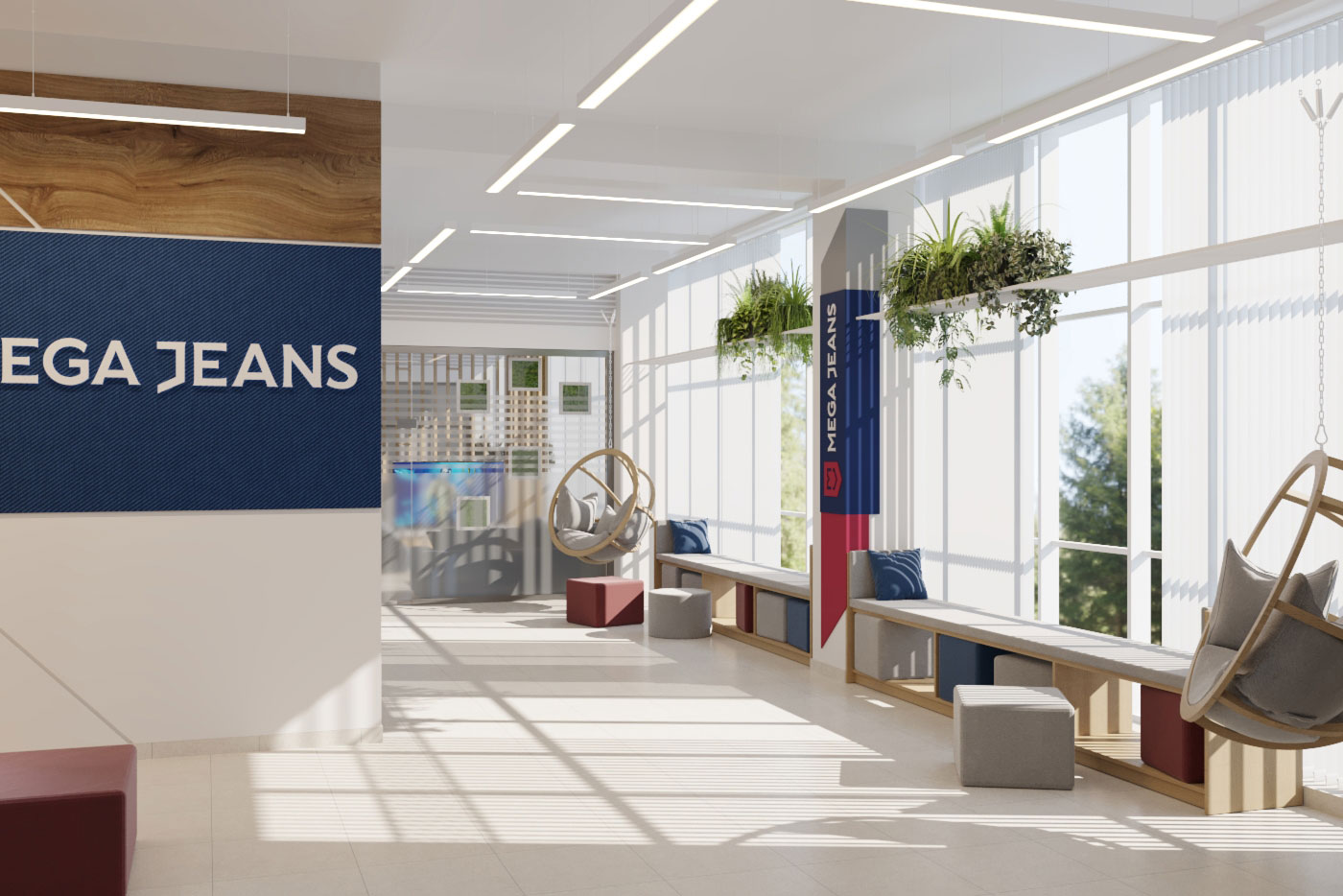 Дизайн проект интерьера офиса компании Mega Jeans в Кирове, общая площадь - 475 кв.м. Разработка дизайн проекта выполнялась в соответствии с Brand Book компании, с учетом фирменного стиля и утвержденных оттенков.