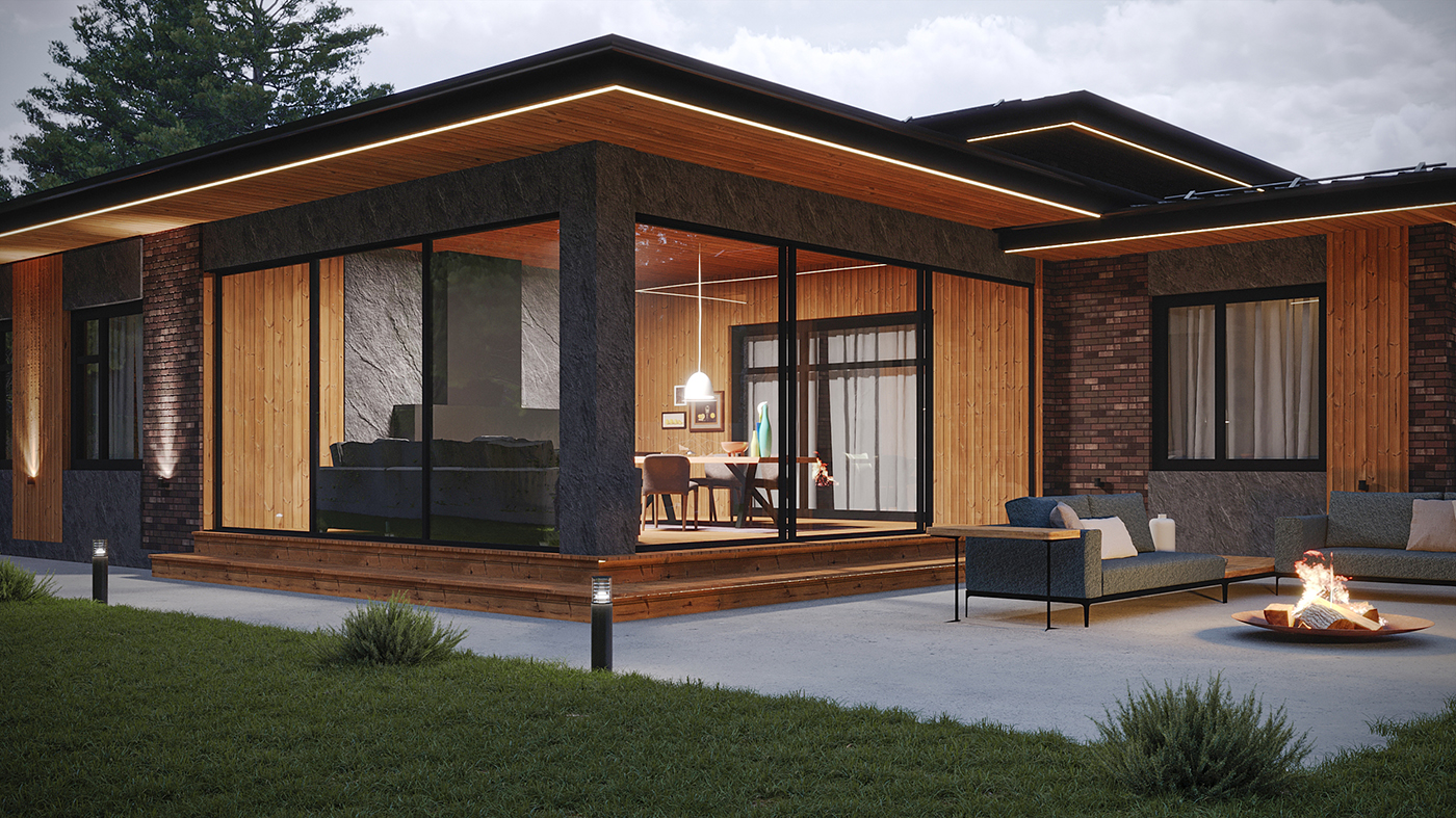 3D визуализация одноэтажного дома в стиле Райта с панорамным остеклением и навесом для авто. Оформление фасада - в отделке сочетается материалы с разными цветами и фактурами: камень, дерево, штукатурка.