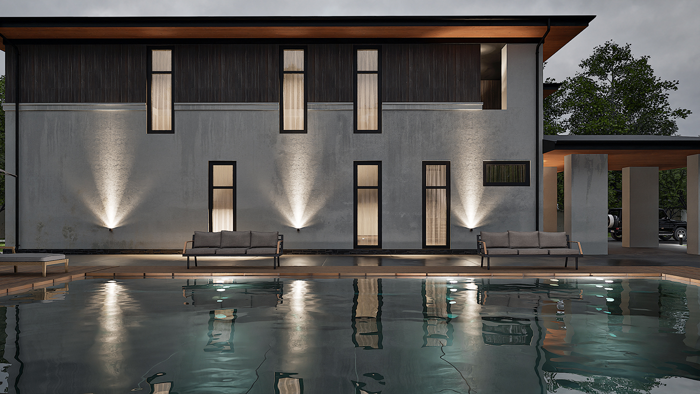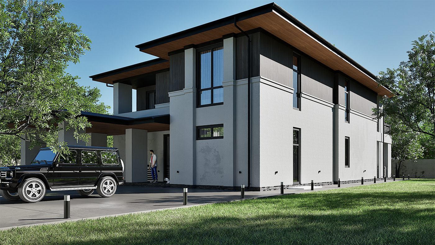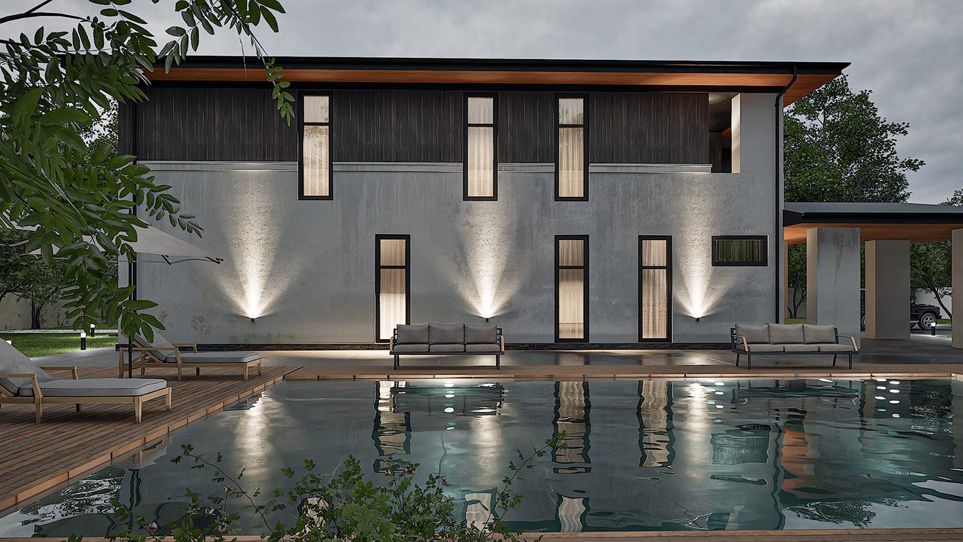 3d визуализация 2-х этажного дома в современном стиле с террасой, балконом и бассейном. Оформление фасада: сочетание фактур дерева разных оттенков и декоративной штукатурки.
