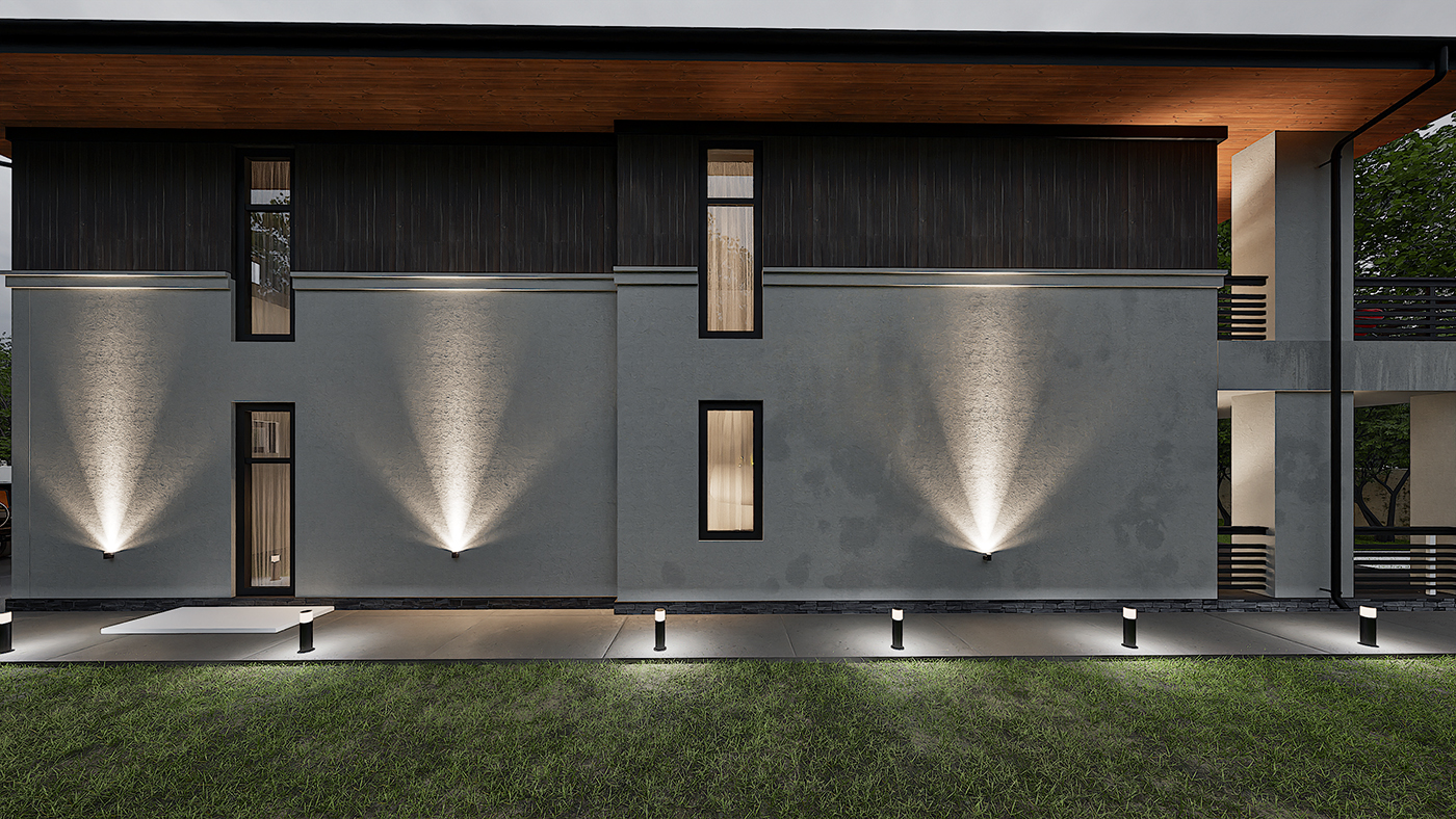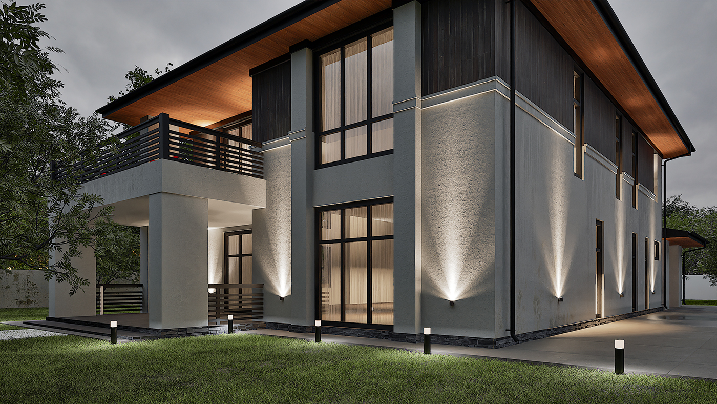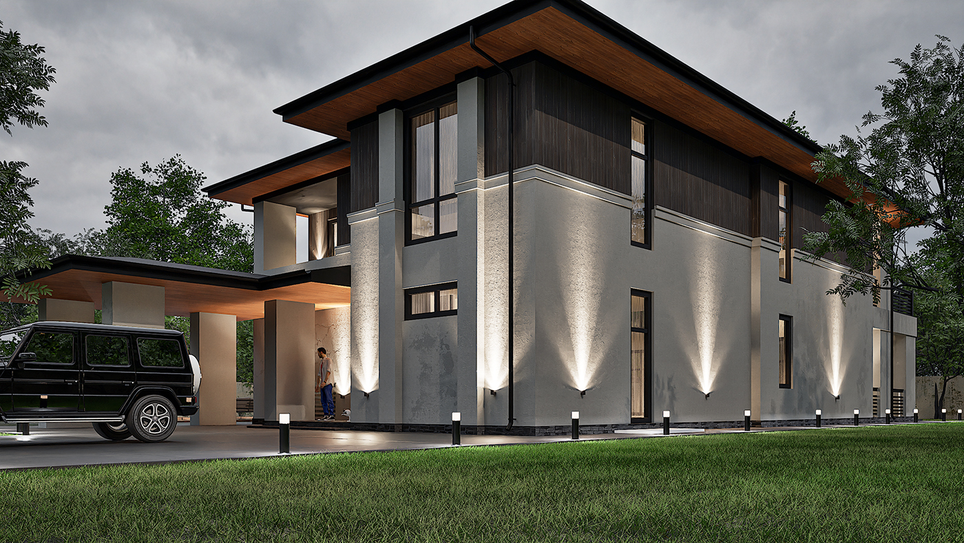 3d визуализация 2-х этажного дома в современном стиле с террасой, балконом и бассейном. Оформление фасада: сочетание фактур дерева разных оттенков и декоративной штукатурки.