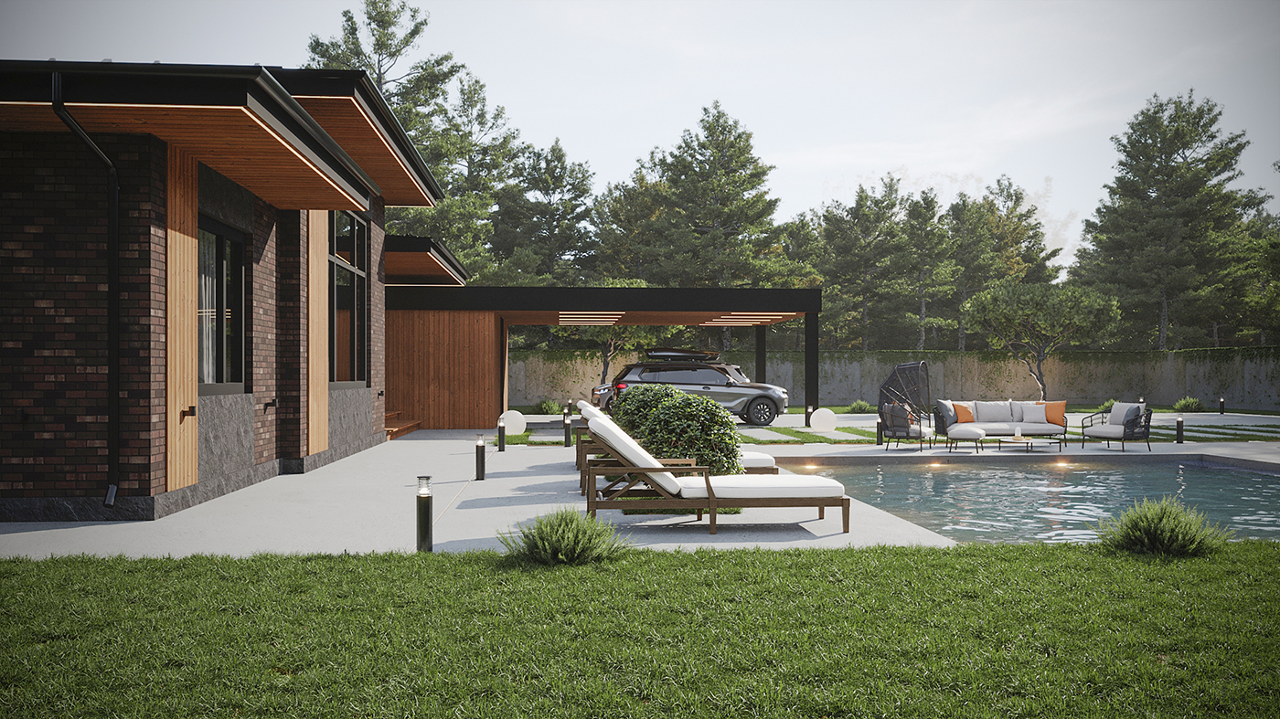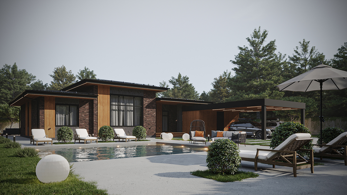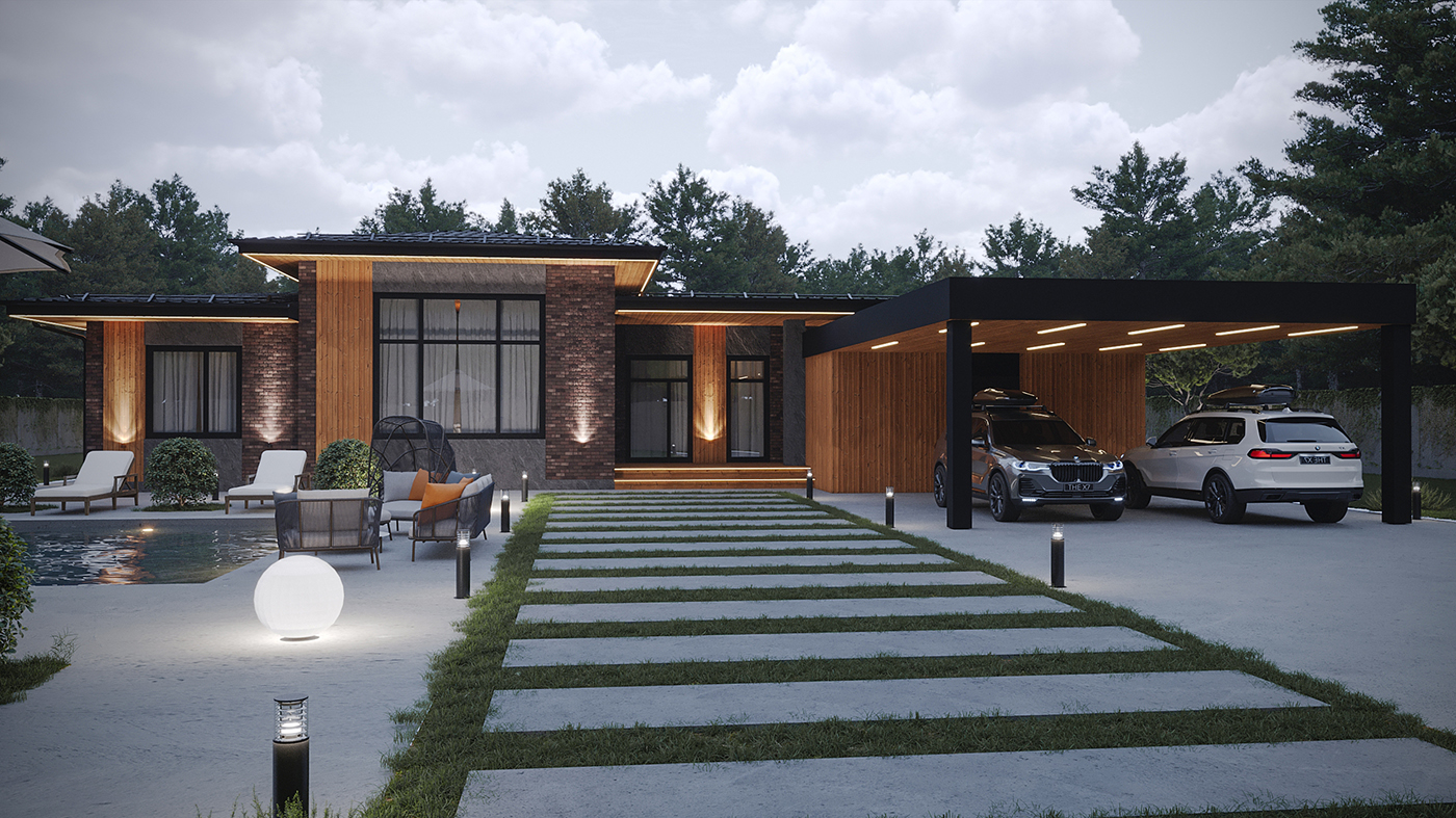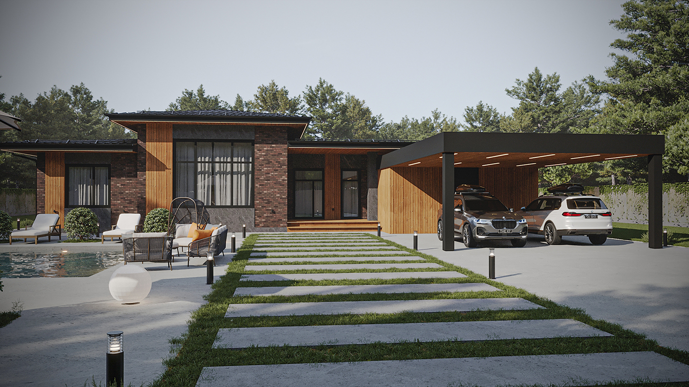 3D визуализация одноэтажного дома в стиле Райта с панорамным остеклением и навесом для авто. Оформление фасада - в отделке сочетается материалы с разными цветами и фактурами: камень, дерево, штукатурка.