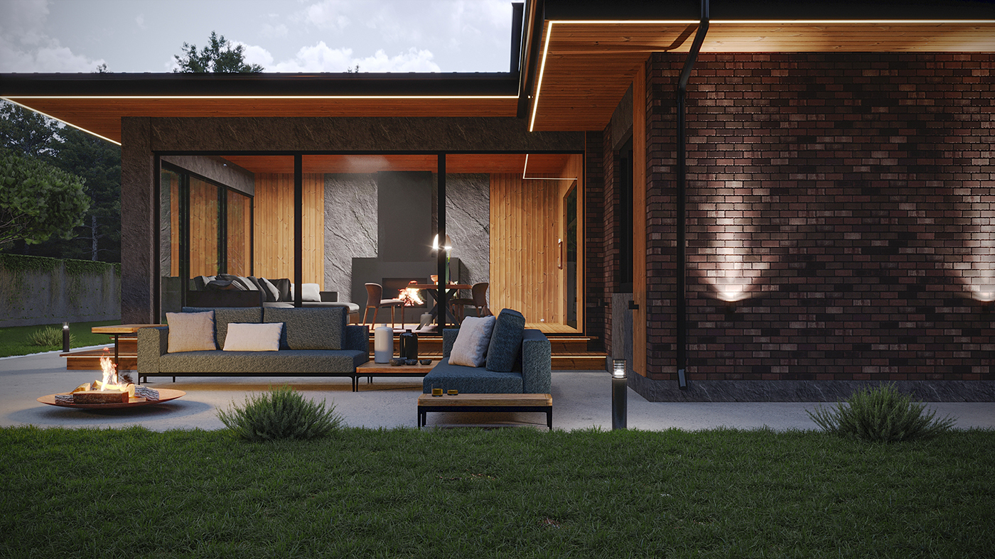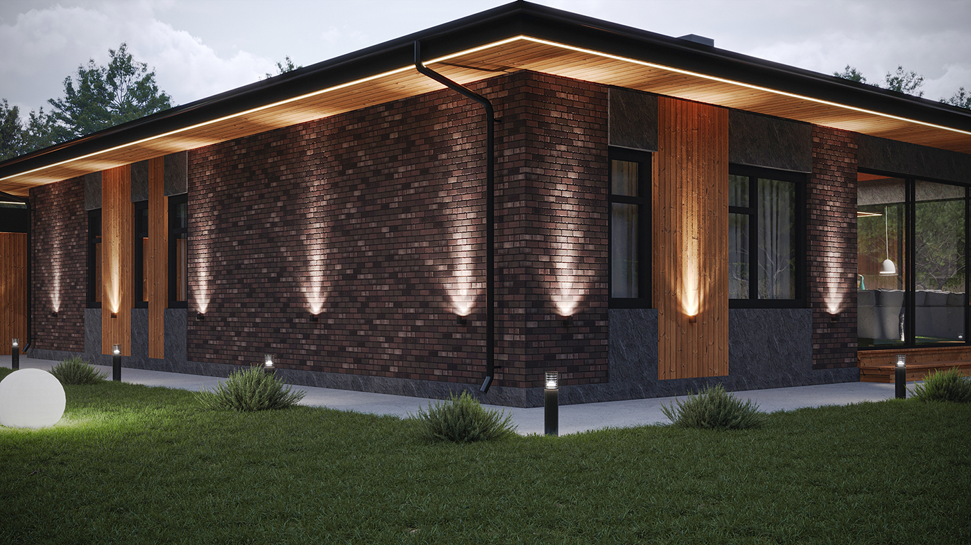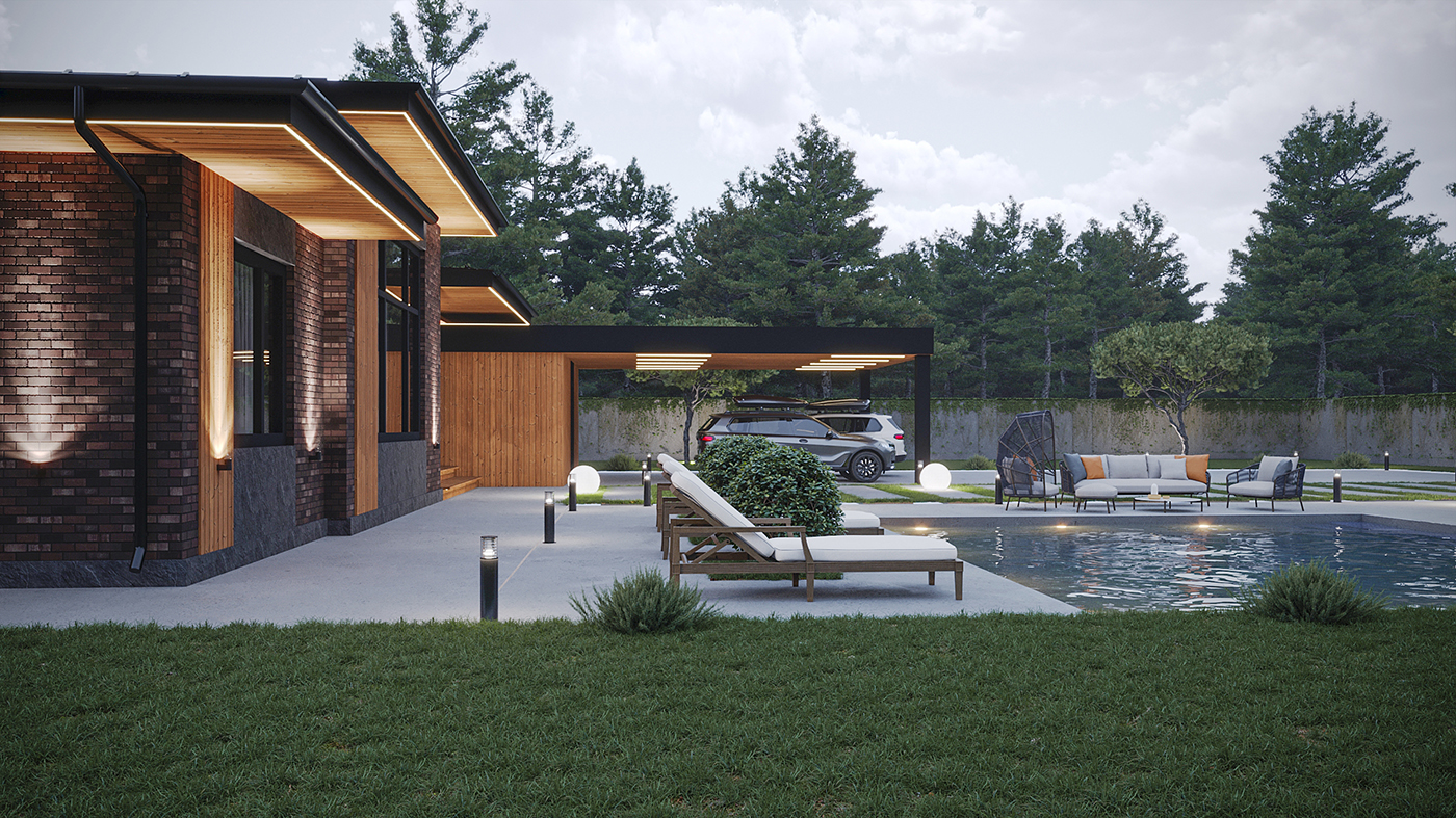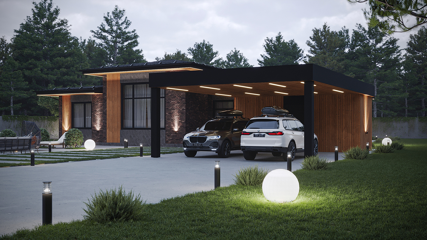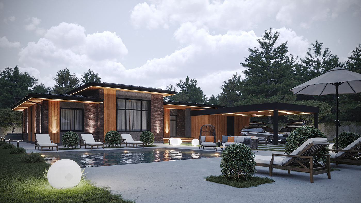 3D визуализация одноэтажного дома в стиле Райта с панорамным остеклением и навесом для авто. Оформление фасада - в отделке сочетается материалы с разными цветами и фактурами: камень, дерево, штукатурка.