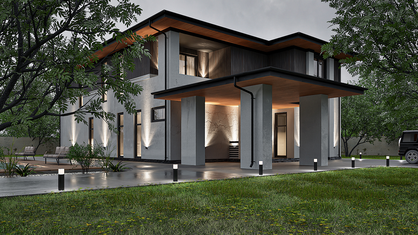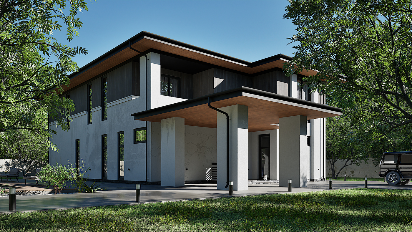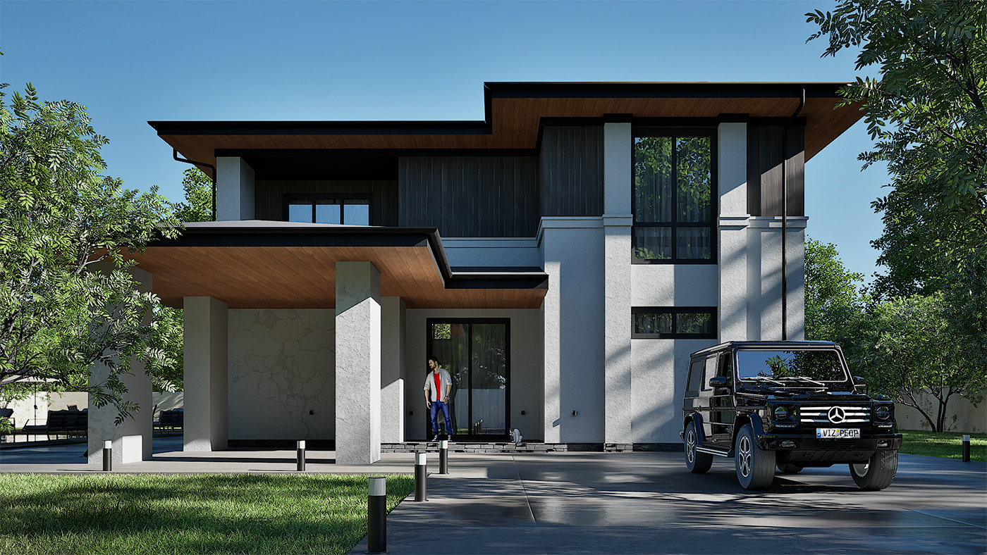 3d визуализация 2-х этажного дома в современном стиле с террасой, балконом и бассейном. Оформление фасада: сочетание фактур дерева разных оттенков и декоративной штукатурки.