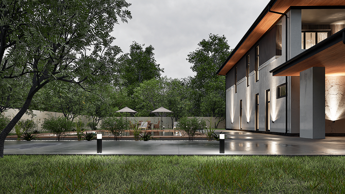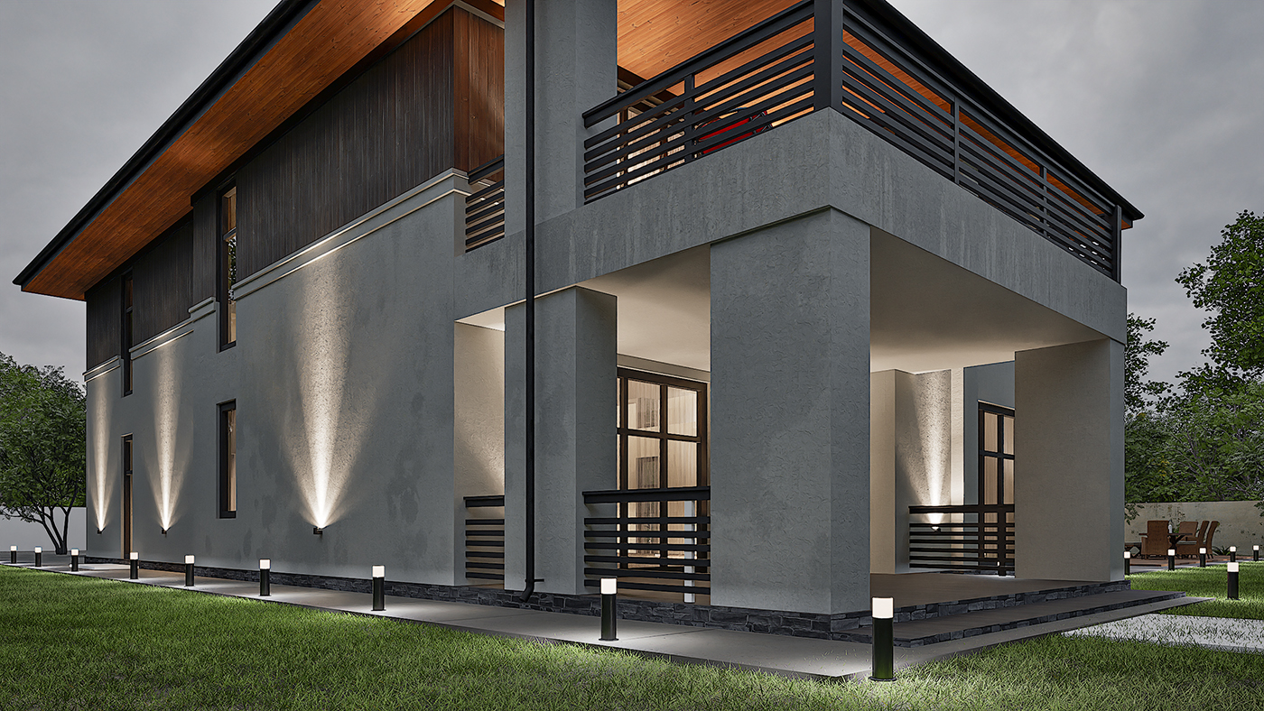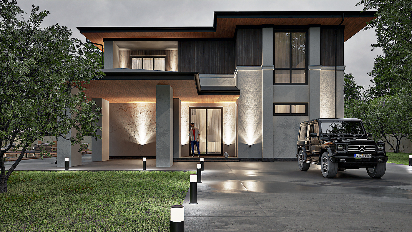 3d визуализация 2-х этажного дома в современном стиле с террасой, балконом и бассейном. Оформление фасада: сочетание фактур дерева разных оттенков и декоративной штукатурки.