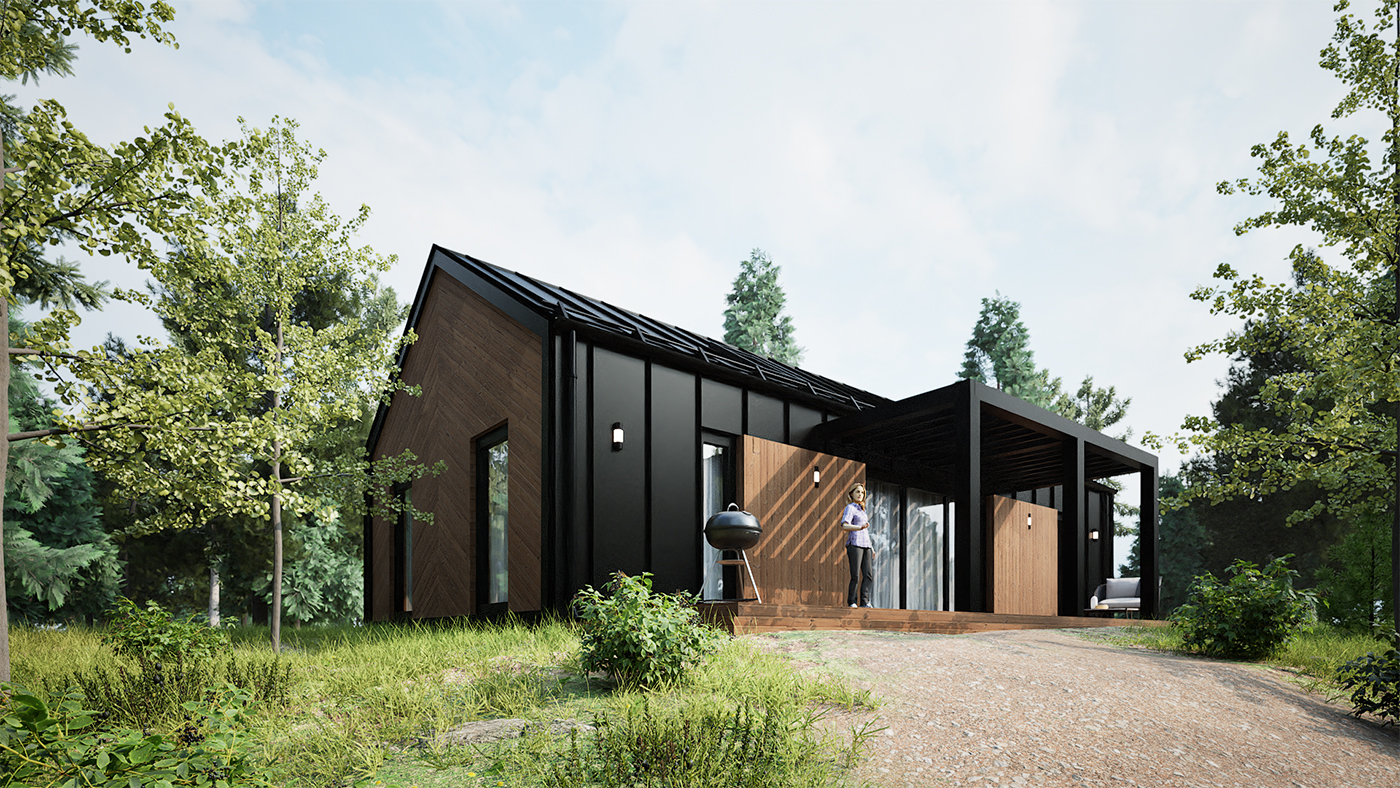 3d визуализация одноэтажного дома в стиле Барнхаус с мансардой. Отделка фасада - крашеный профнастил, дерево.