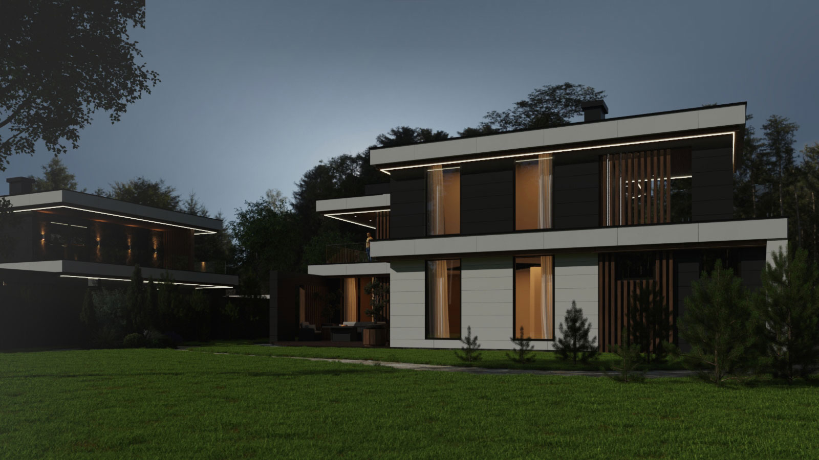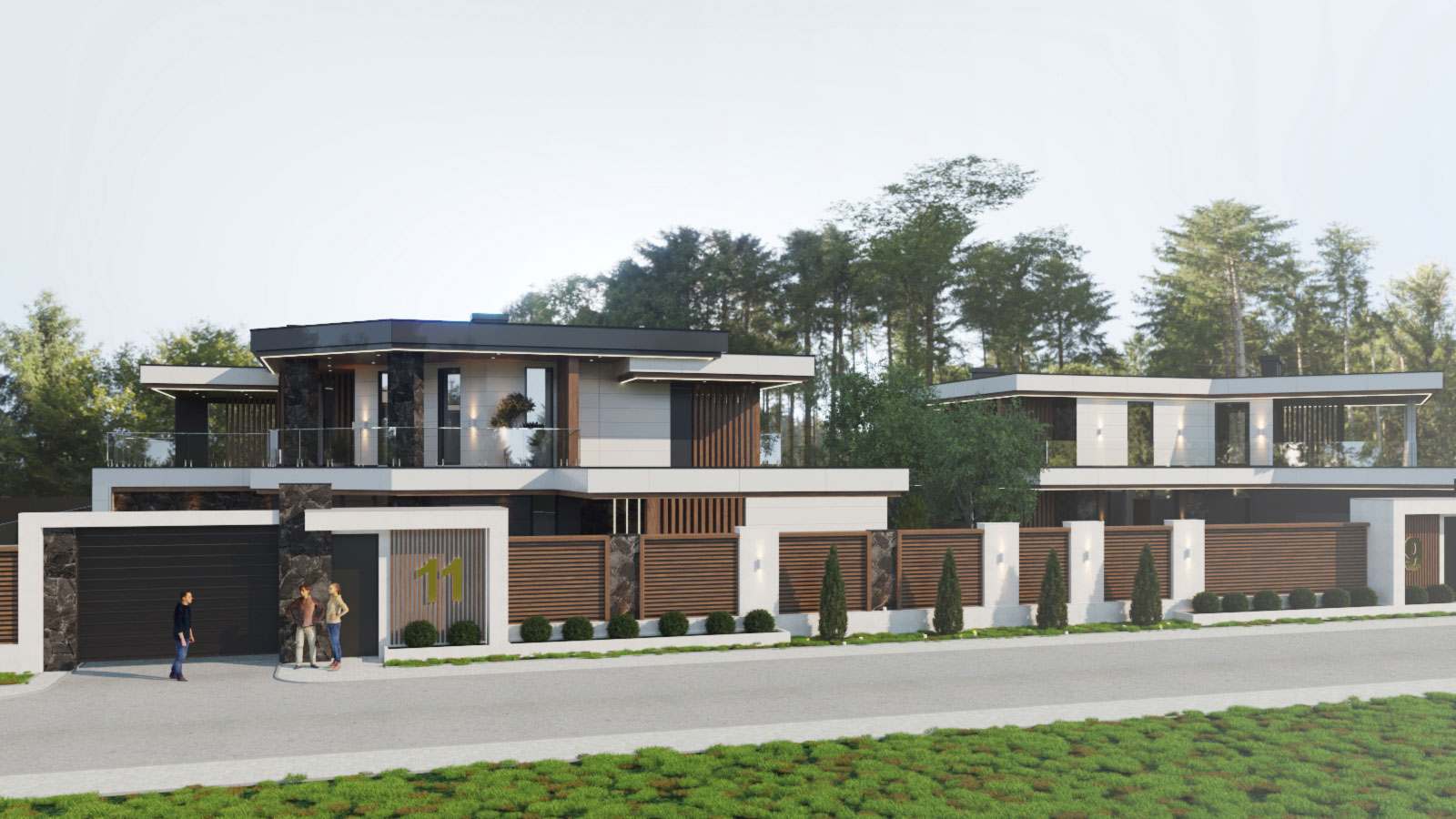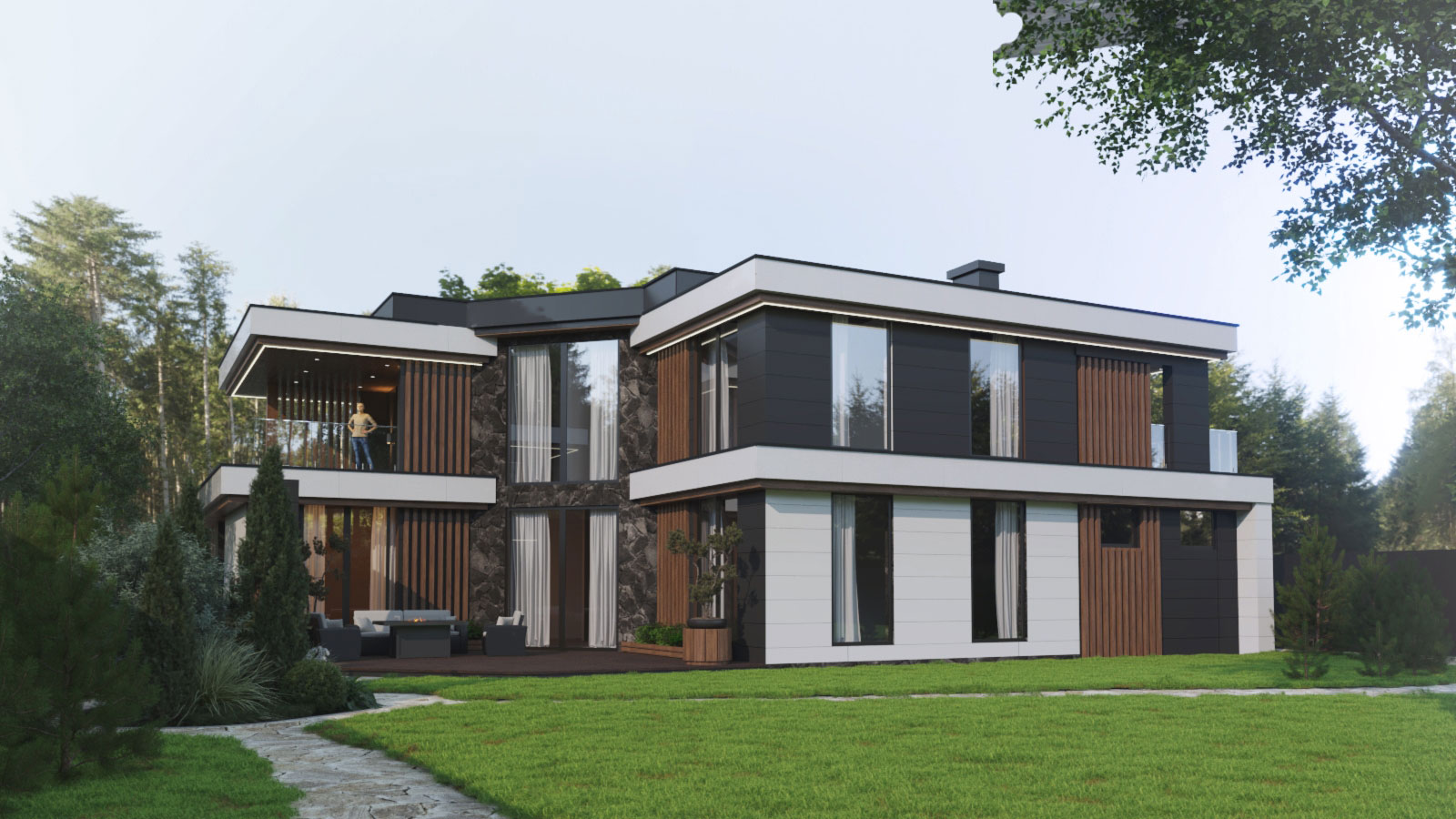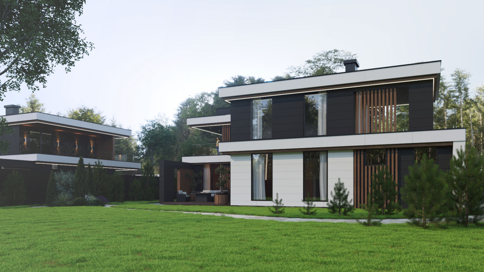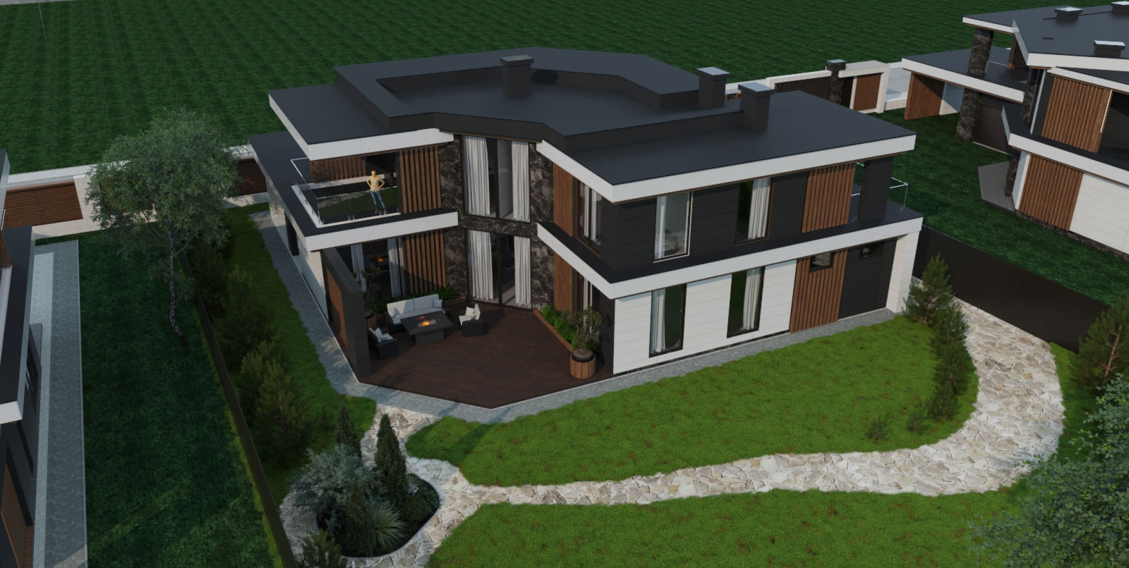 Архитектурный проект загородного дома 250 кв.м. в коттеджном поселке. Для клиента выполнена разработка 3 типов современных двухэтажных домов в единой стилистике, с индивидуальными архитектурными особенностями и планировкой, которую по желанию конечного клиента можно изменить.