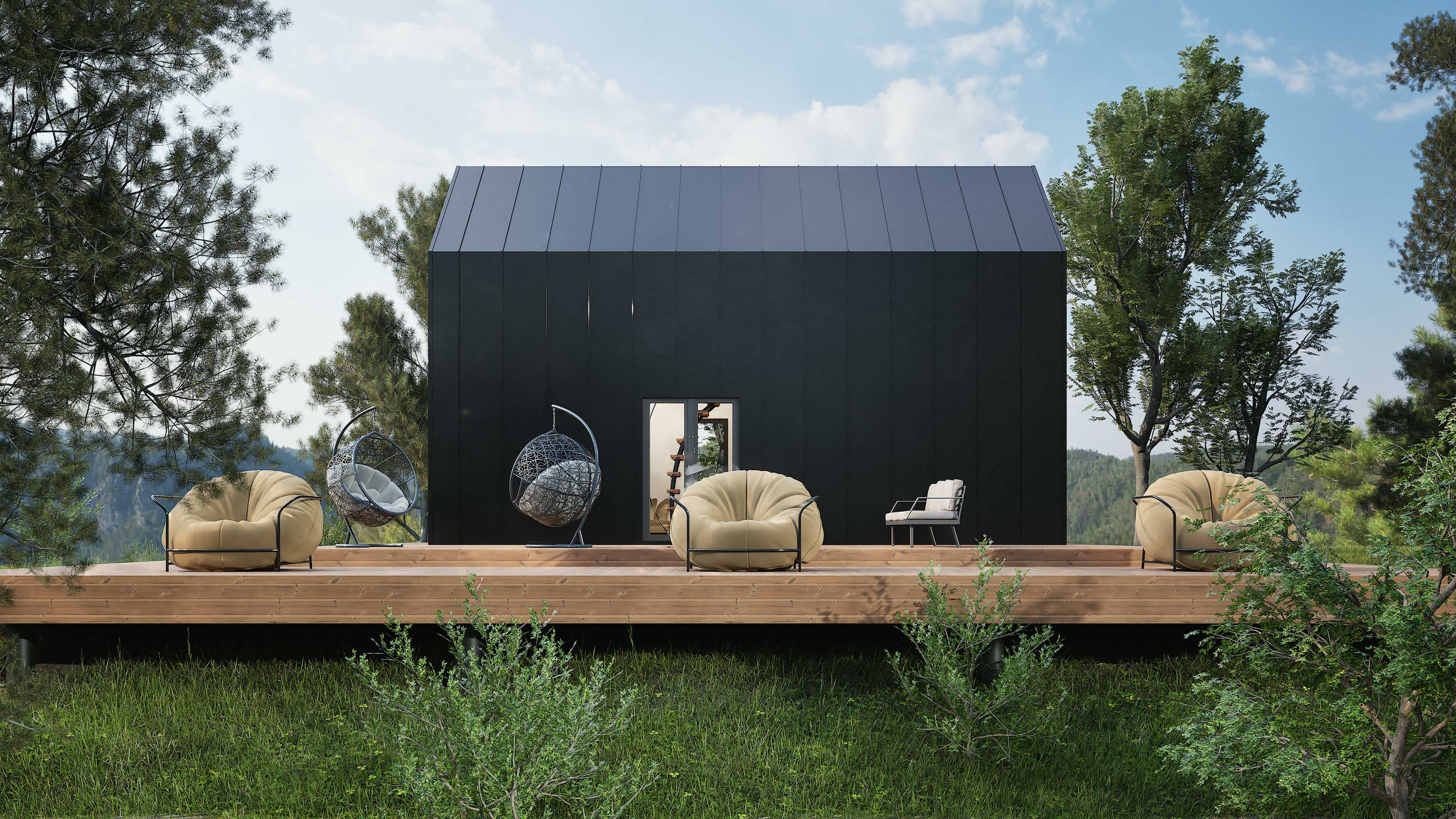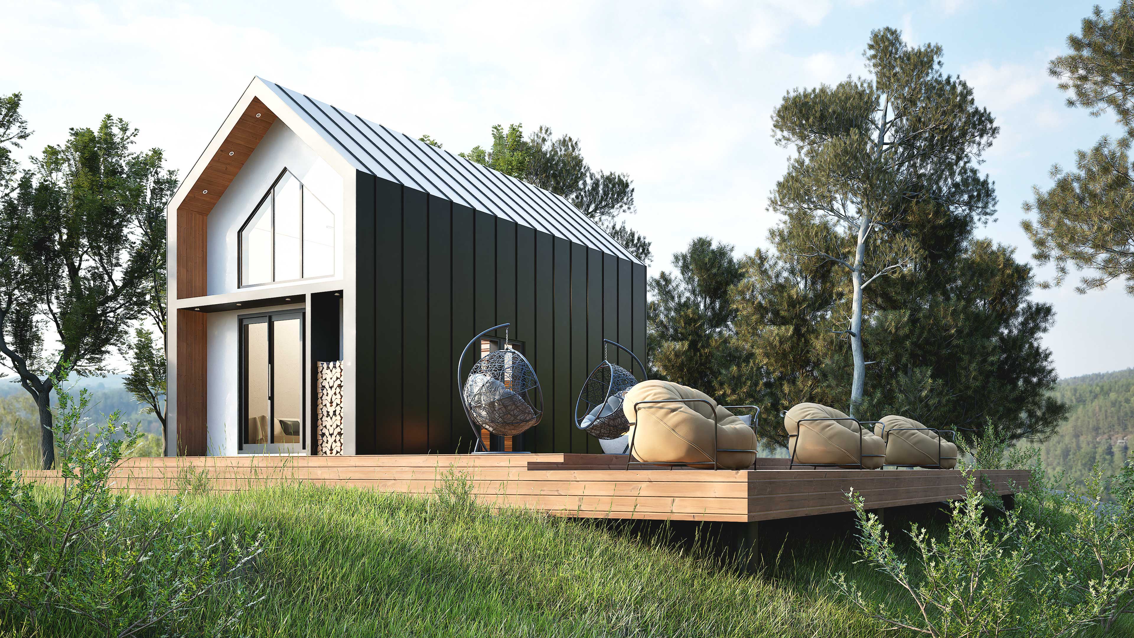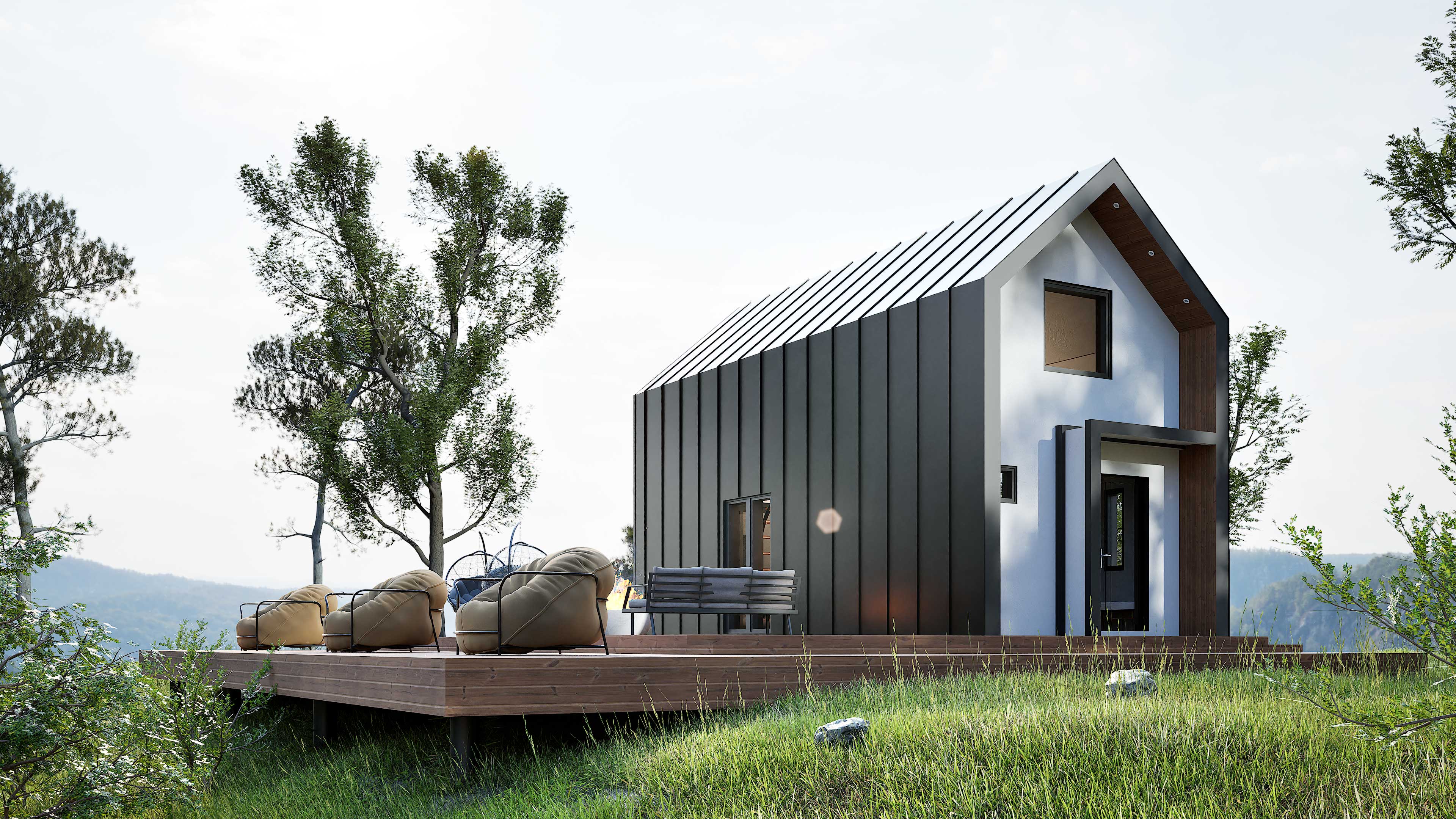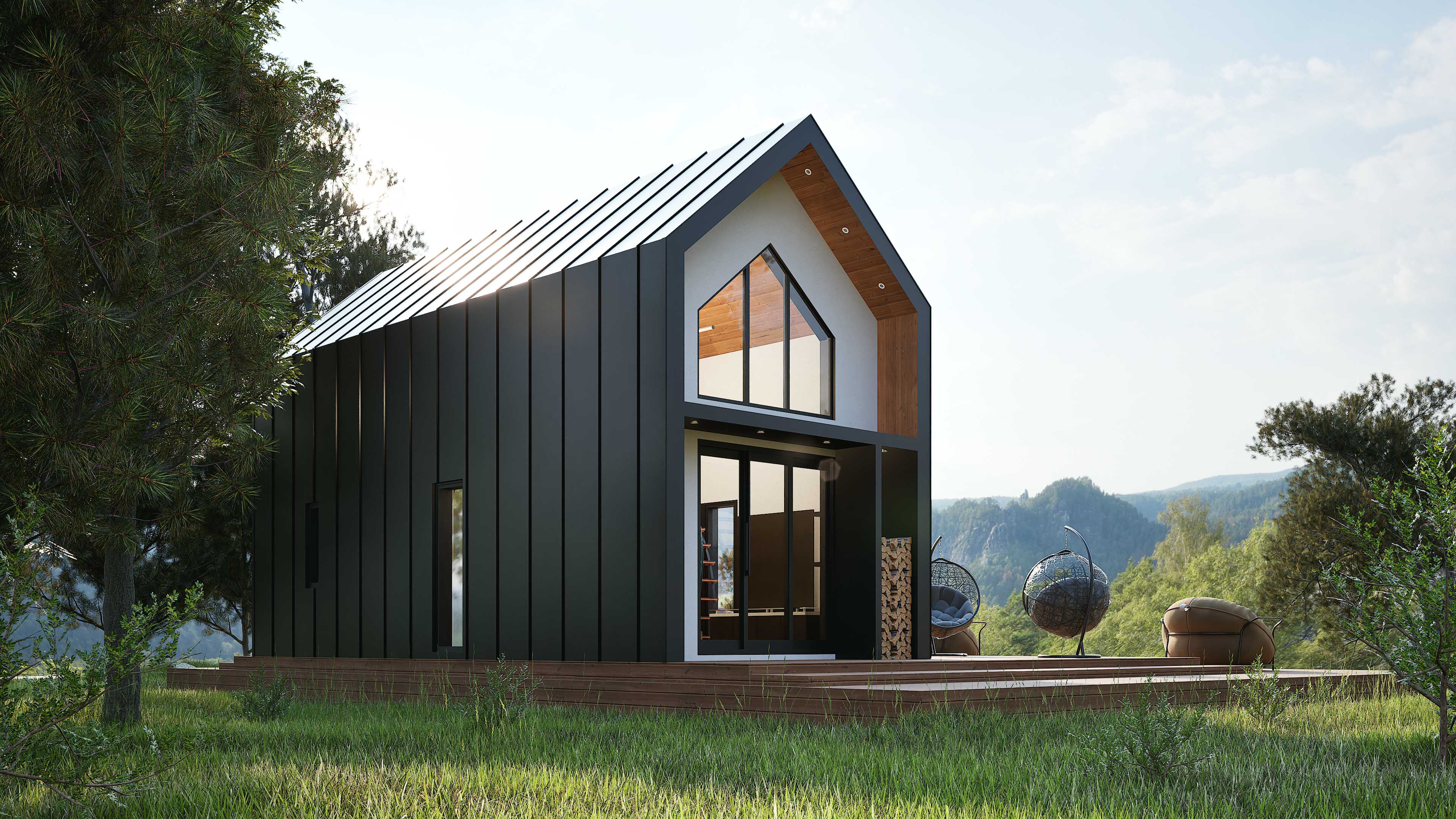 3d визуализация одноэтажного дома в стиле Барнхаус с террасой. Отделка фасада - крашеный профнастил, дерево.