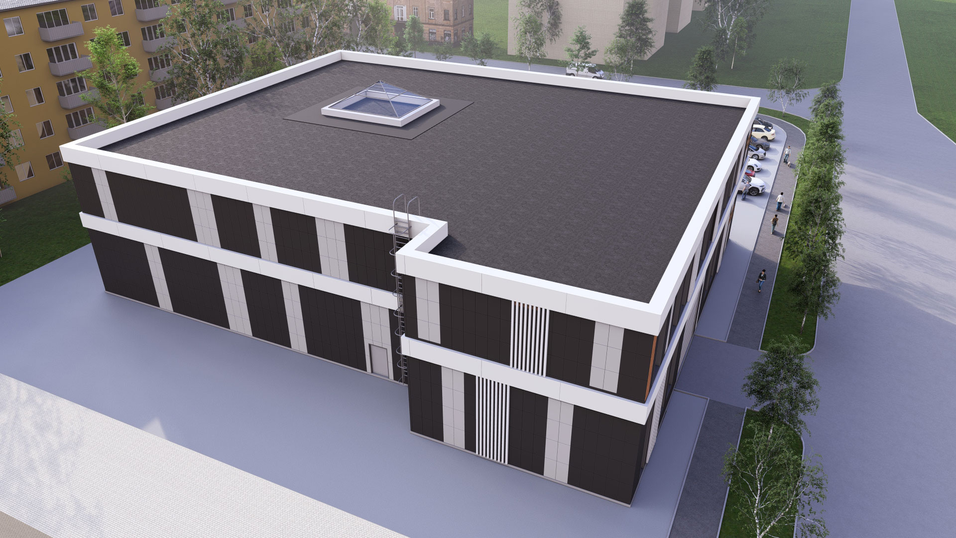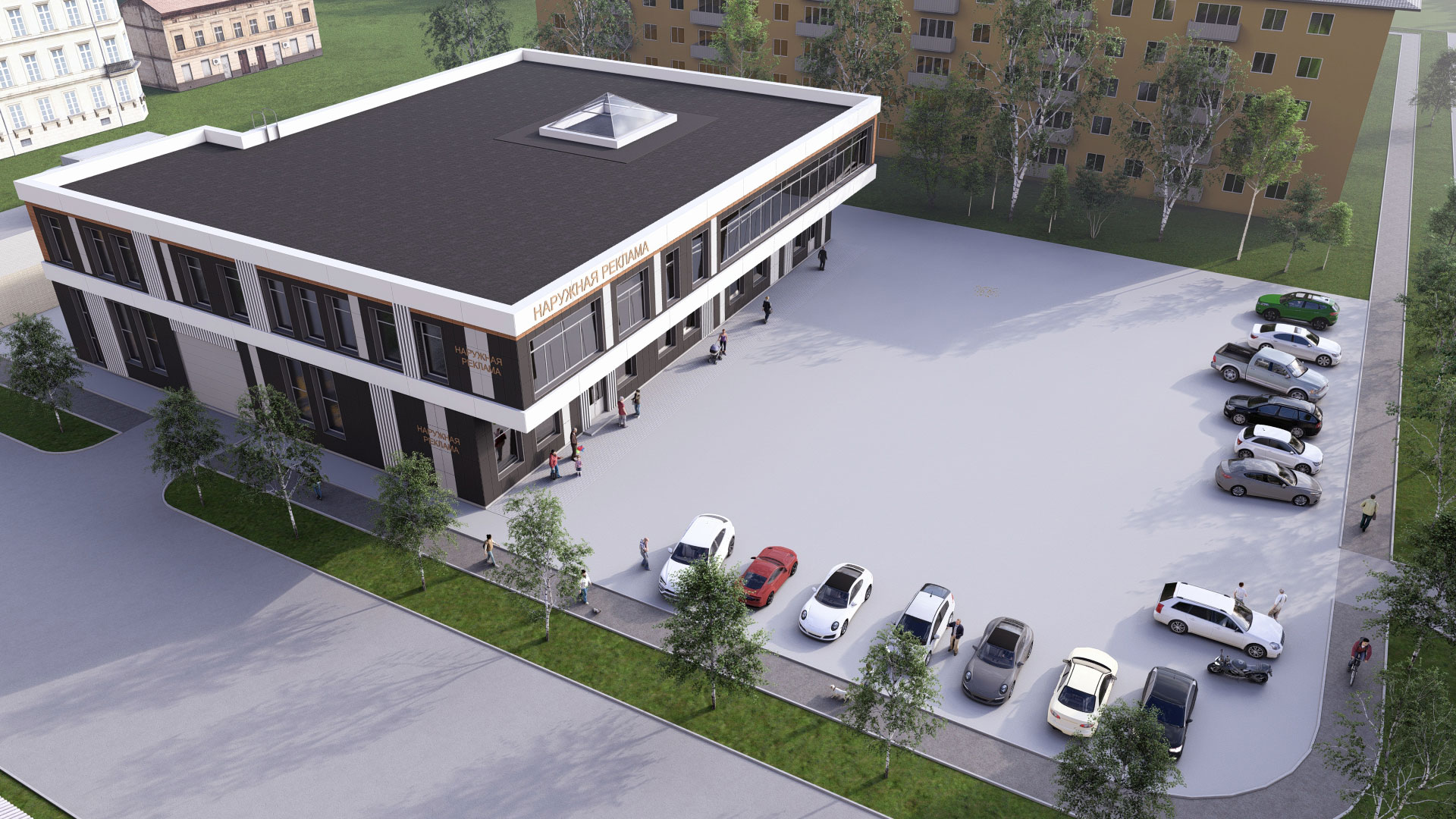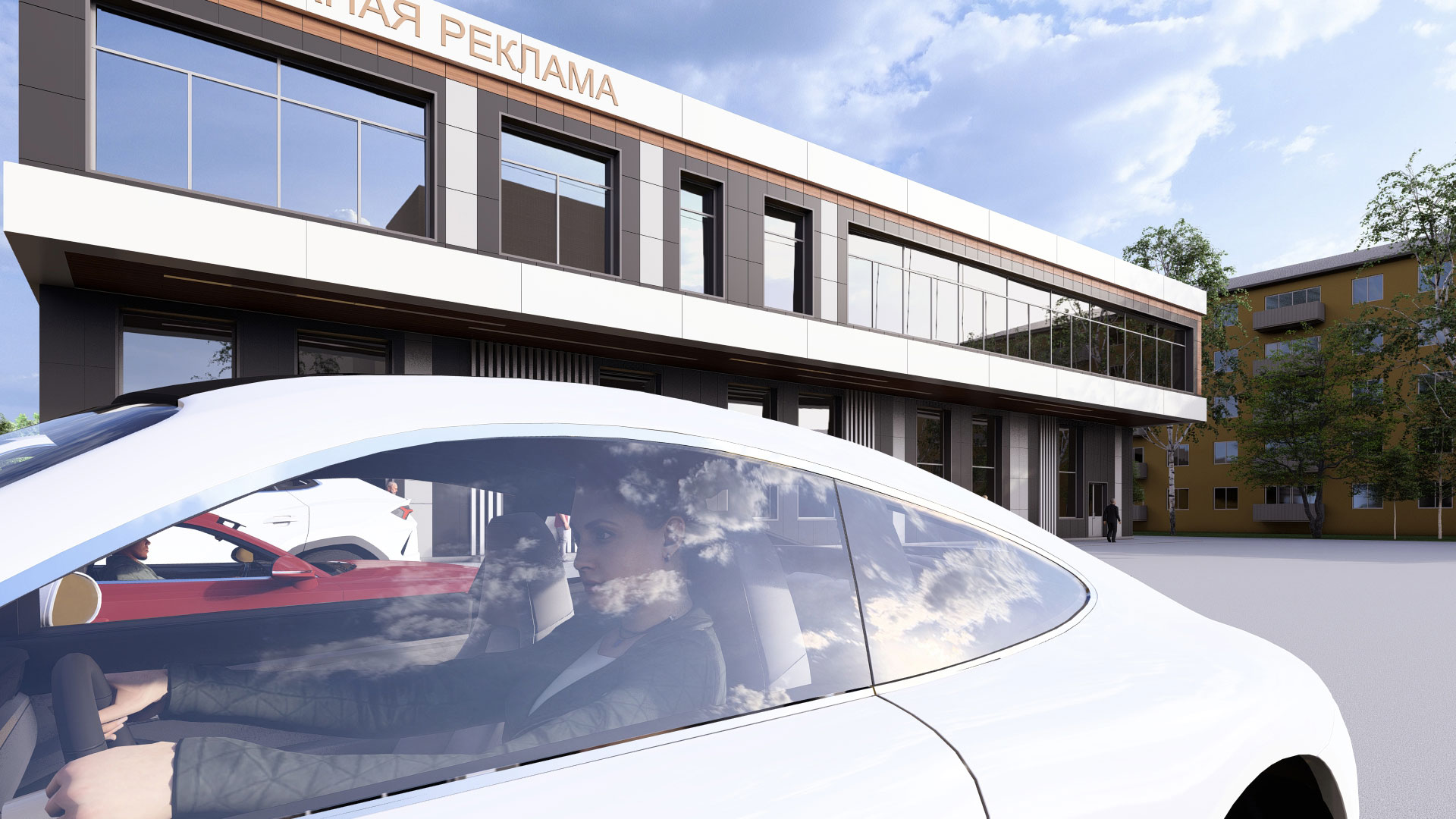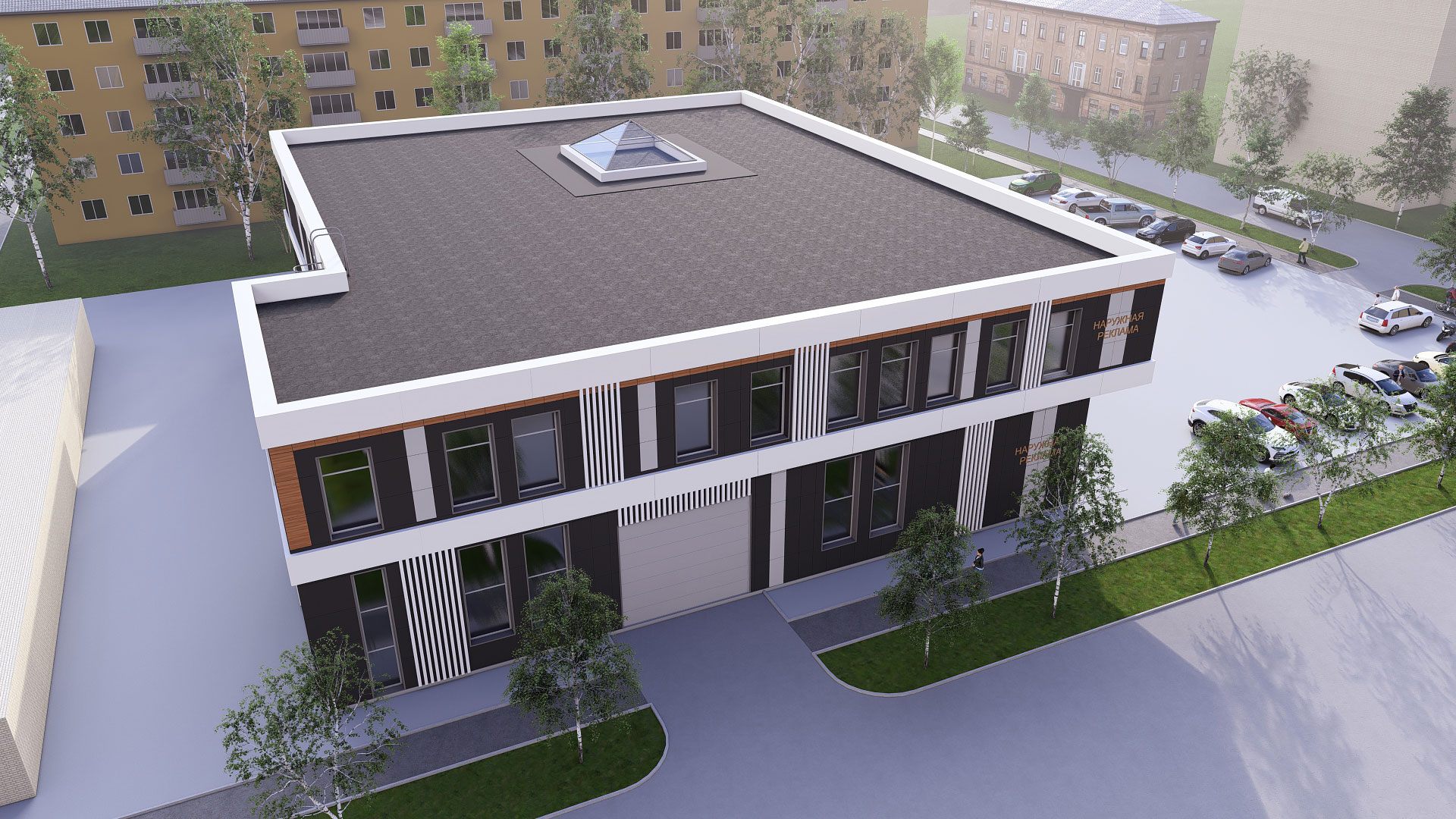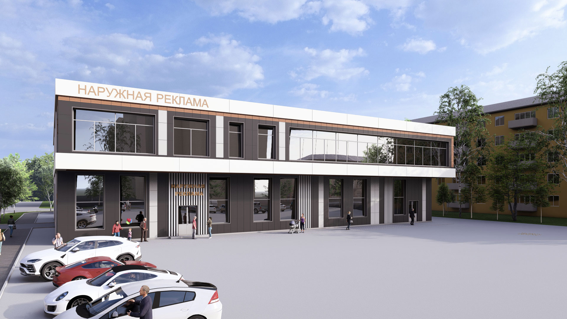 3d визуализация двухэтажного торгового центра в современном стиле с парковкой. Отделка фасада - вентилируемый фасад из керамогранита контрастных оттенков.