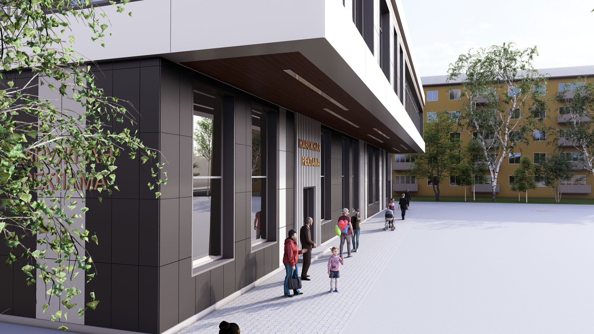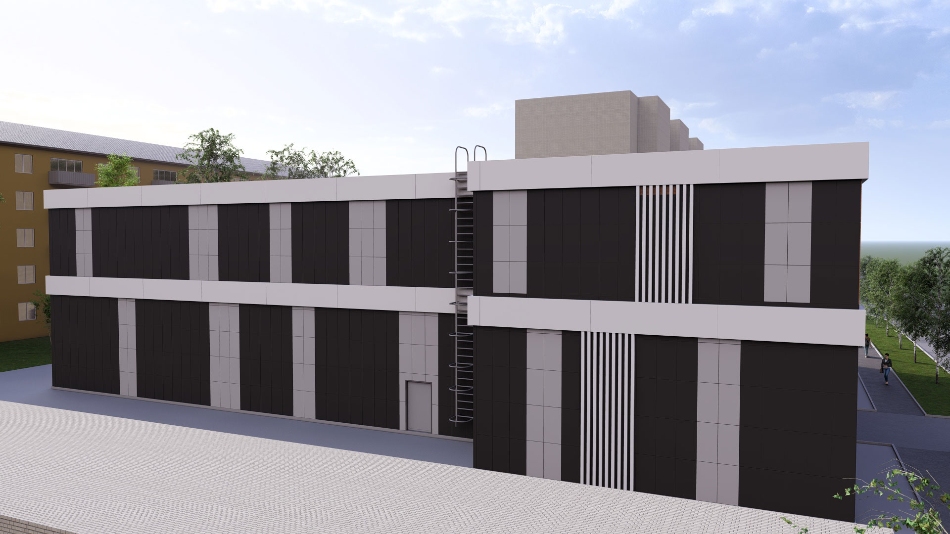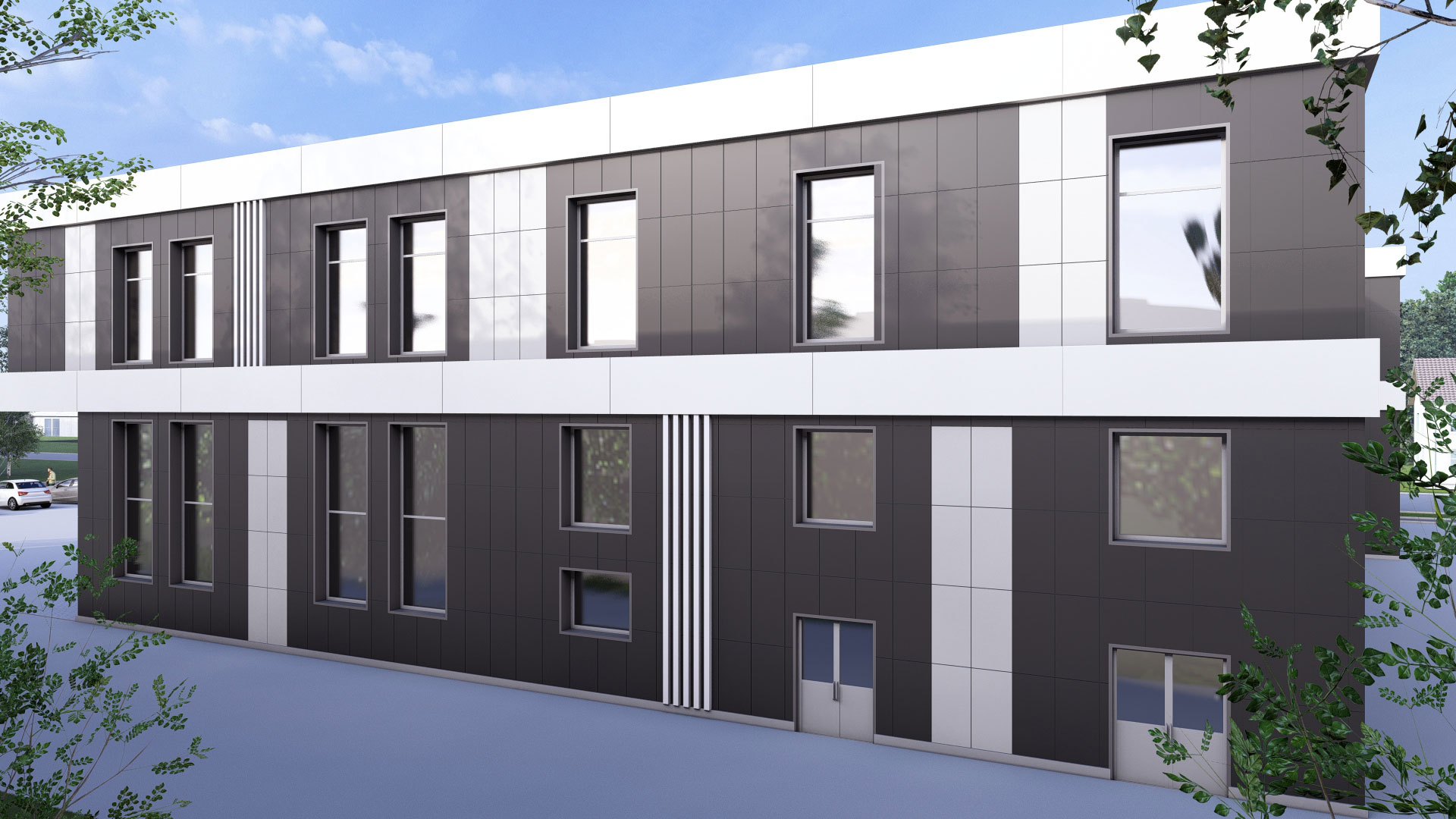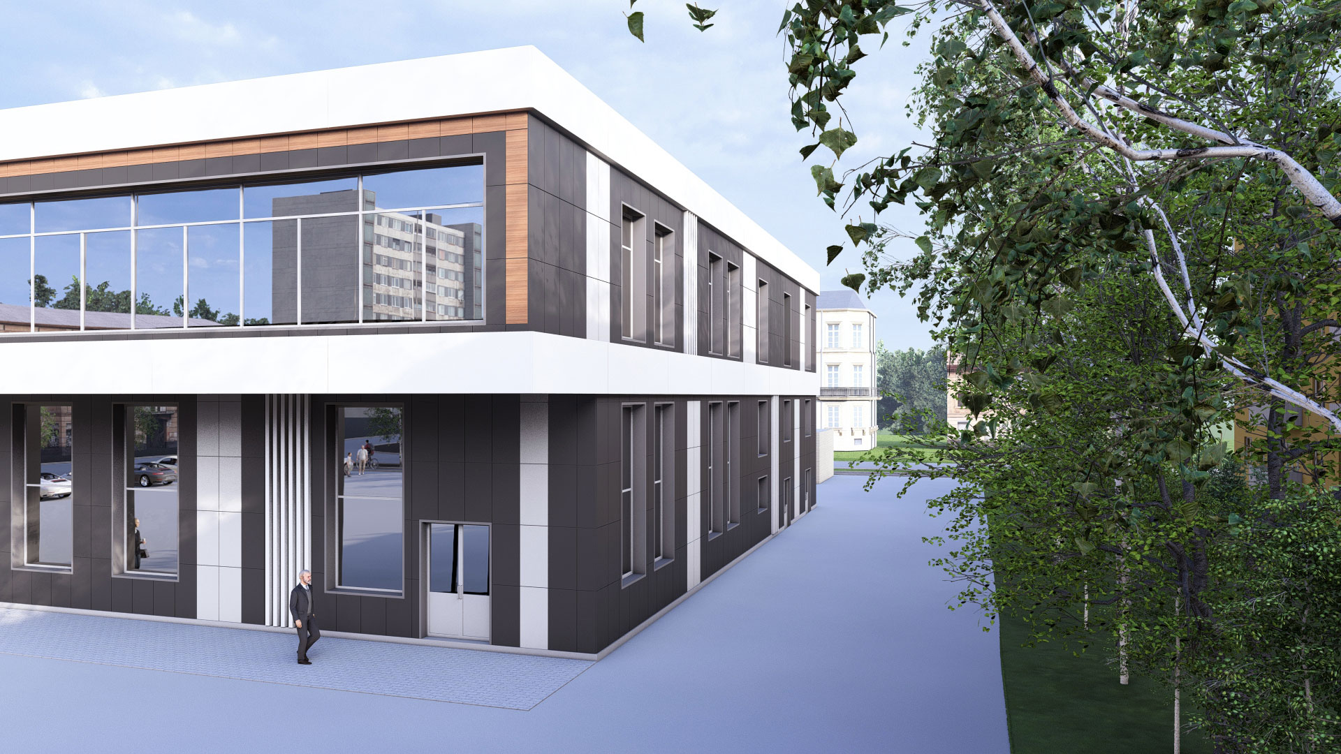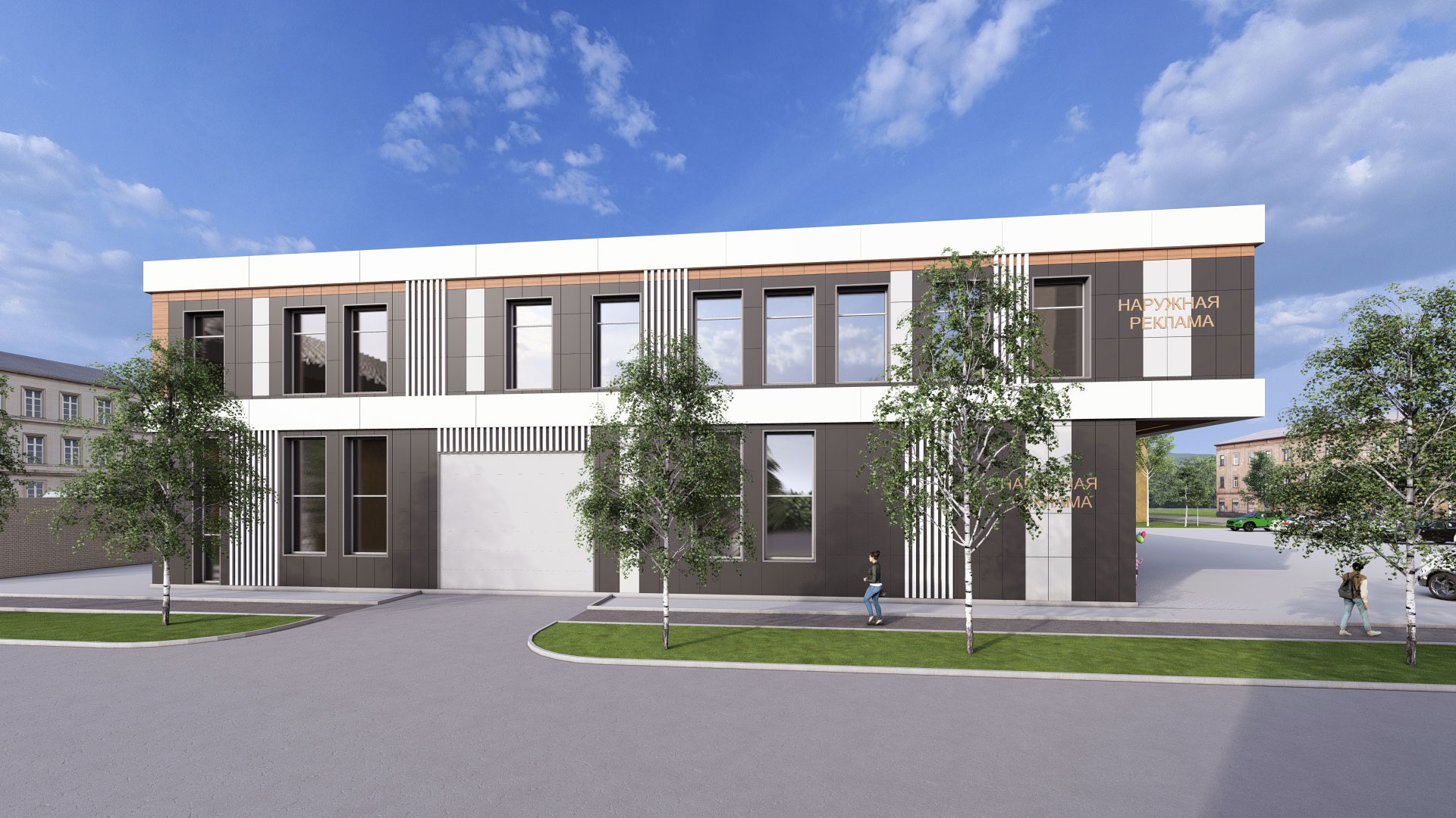 3d визуализация двухэтажного торгового центра в современном стиле с парковкой. Отделка фасада - вентилируемый фасад из керамогранита контрастных оттенков.